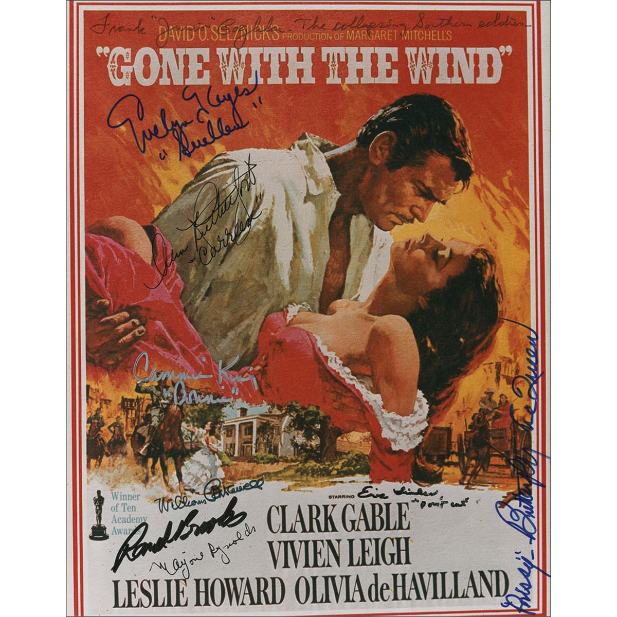 Color glossy 8 x 10 photo of a film poster for Gone With the Wind, signed in felt tip and ballpoint by Evelyn Keyes, Ann Rutherford, Cammie King, Butterfly McQueen, William Bakewell, Rand Brooks, Marjorie Reynolds, Eric Linden, and Frank Coghlan, Jr., with six also adding their character names. In fine condition.