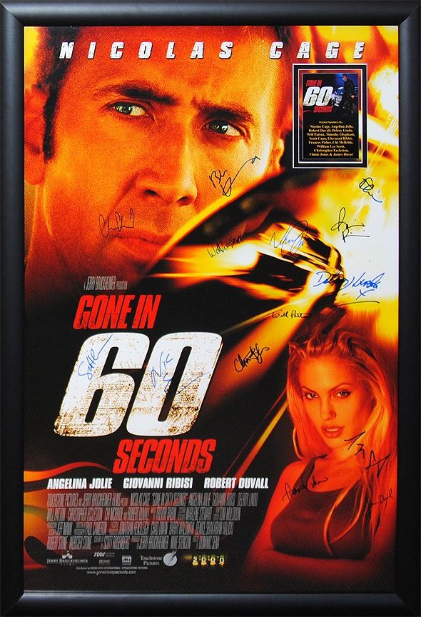 "Gone in 60 Seconds" Signed movie poster from the action hit by Nicolas Cage, Angelina Jolie, Robert Duvall, Delroy Lindo, Will Patton, Timothy Olyphant, Scott Caan, Giovanni Ribisi, Frances Fisher, Chi McBride, William Lee Scott, Christopher Eccleston, Vinnie Jones and James Duval. This item comes with a Certificate of Authenticity from a third party authenticator. This Certification of Authenticity does not imply that the item will be certified by any other rival authentication companies. The accompanied certification is the only certification the auction company can confirm. These items are being sold as collectable pieces and there is no guarantee that this item can be resold on any online marketplace. Each of these companies has their own policies and politics.
