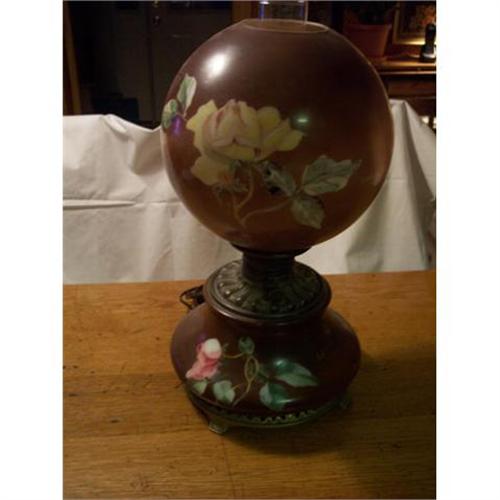 Beautiful lamp with Roses painted on.Has the original globe with it and chimney.This lamp has been electrified at some time.Could probably be reverted back to oil if you so desired.The on-off switch sometimes works and sometimes does not.Should probably be re-placed.On the wick turner it says Made In US of America.I can find no other info on it.Stands 18 1/2" tall.This must be shipped in two boxes for safety.The base lights up also.