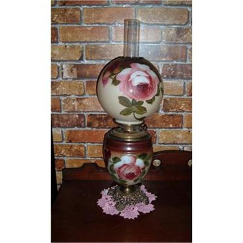 This is a beautiful Gone with the Wind oil lamp with hand painted roses. It has never been electrified.It is marked Pat.1875. There is a slight crack in the brass base seen in image four that should easily be repaired.Includes brass ring on top globe. Don't know if chimney is original.