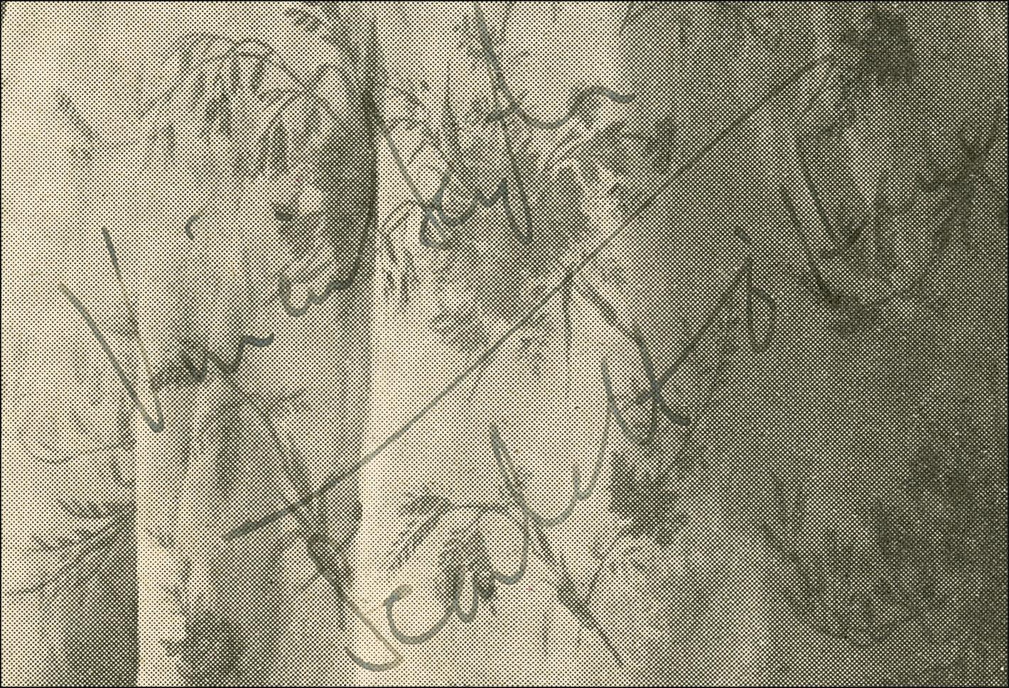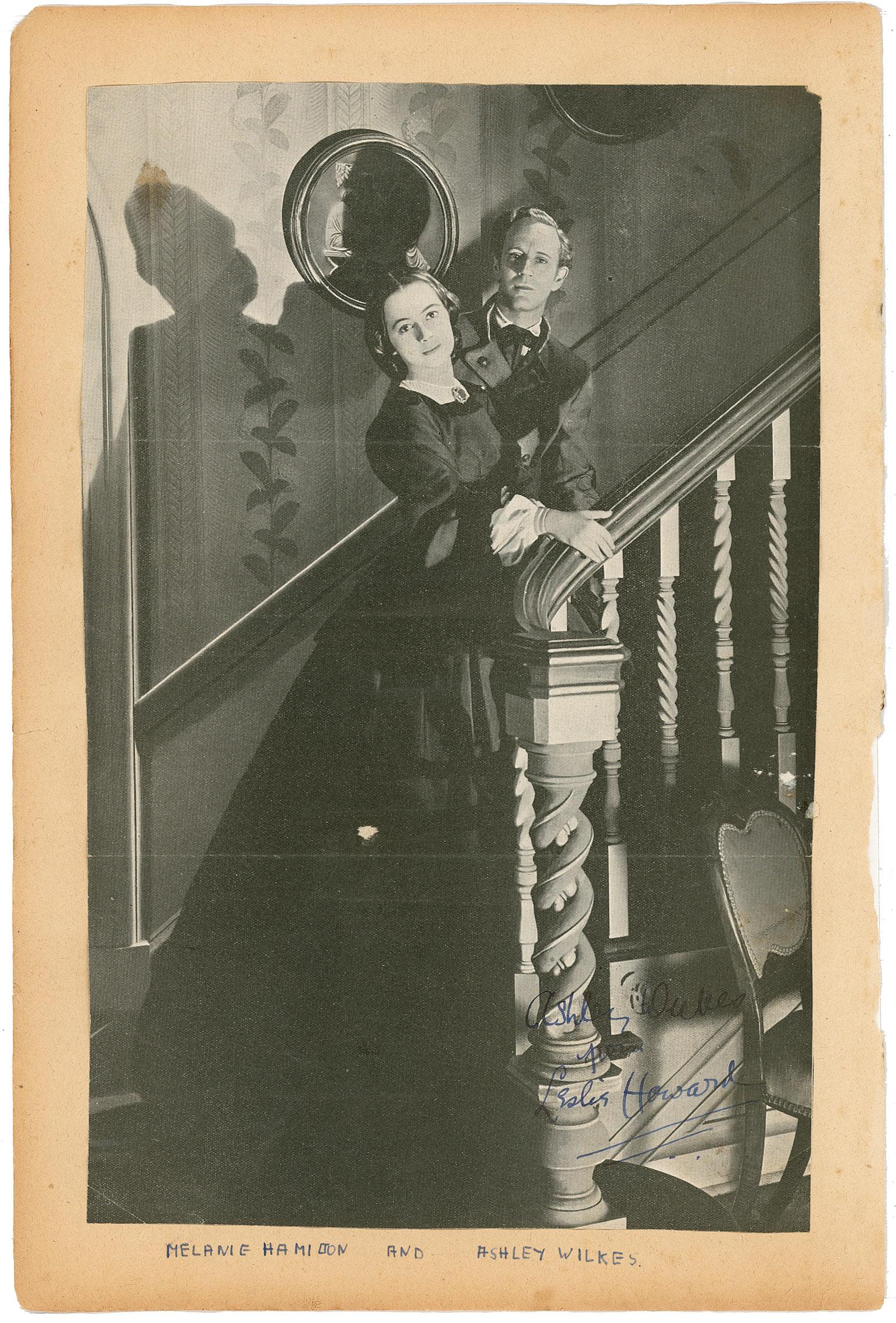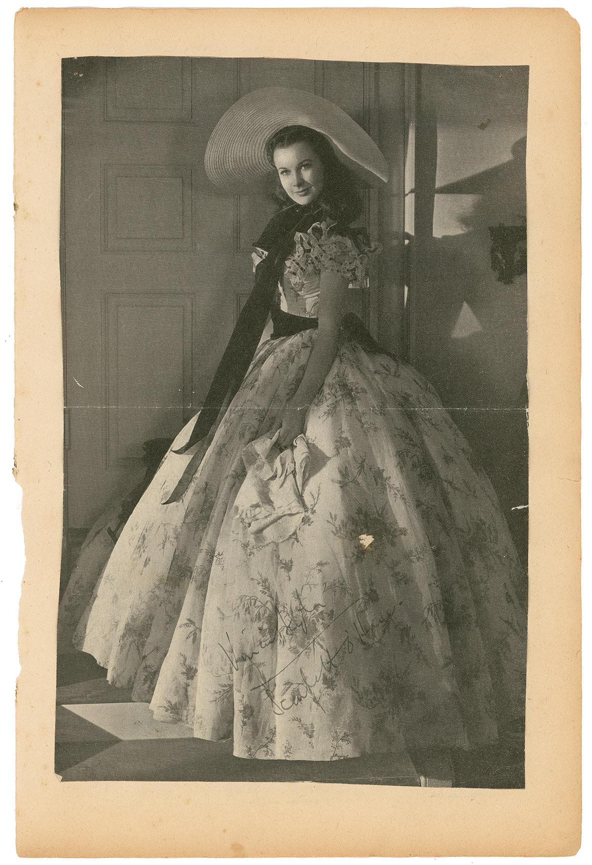 Unbelievable and perhaps one-of-a-kind pair of vintage magazine photos affixed to either side of a 10.5 x 16 scrapbook page: first photo is of Leigh as Scarlett O’Hara, measuring 8.75 x 13.5, and signed in fountain pen, “Vivien Leigh, Scarlett O’Hara.” Second photo is of Olivia deHavilland and Leslie Howard as Melanie Hamilton and Ashley Wilkes, signed in fountain pen, “Ashley Wilkes from Leslie Howard.” Leigh’s photo bears a central horizontal fold, a few surface marks and a slightly trimmed right edge, otherwise fine condition. Howard’s photo bears two horizontal folds, scattered wrinkling, and some mild toning to corners from adhesive on reverse, otherwise fine condition. An amazing combination of signed images, the first examples we’ve ever encountered with the inclusion of their Gone with the Wind character names. Pre-certified PSA/DNA and RRAuction CO