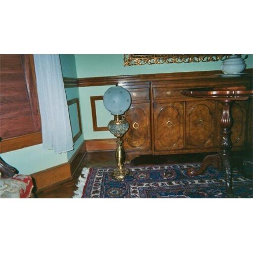 A one of a kind gorgous brass table lamp. It has very intricate detail work on stem, base and top, where it has been electricfied. The glass globe shade has been replaced in the style befitting for this era.