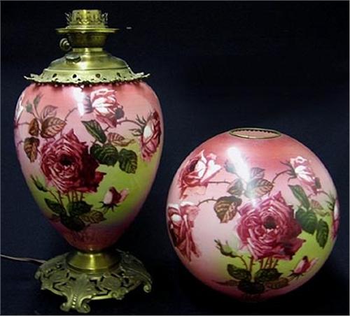 Gone with the Wind lamp; original glass base and shade; rose decoration on yellow and pink ground; converted from oil; 19th C.; approximately 32" high (no visible defects)