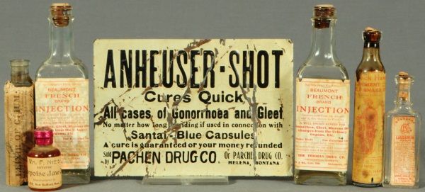 Anheuser-Shot Gonorrhoea & Gleet cure tin sign along with 2 Beaumont French Brand Gonorrhoea Cure Bottles, Bottle of Jack Hawks Rattlesnake Oil, Laudnum Bottle (empty), Bottle of Wm F. Nye's Porpoise Jaw Oil,