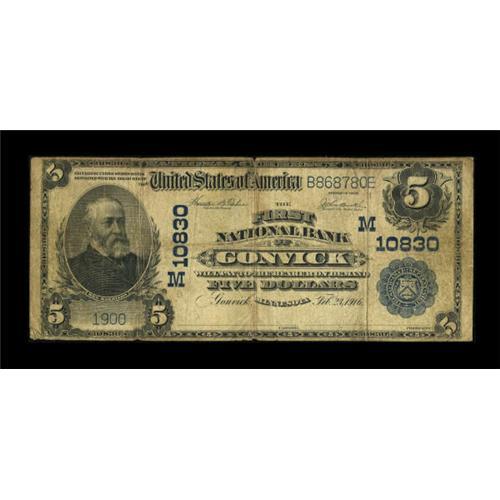 <B>Gonvick, MN</B></I> - $5 1902 Plain Back Fr. 606 <B>The First NB</B></I> Ch. # (M)10830<BR> This is the first time that any example from this Clearwater County location has been offered at public sale to the numismatic community. This bank was the sole issuer in Gonvick, and it lasted for only three years before bowing out in 1926. Two other notes are known, but both have been ensconced in long term Minnesota collections for many years, with little evidence that they will appear on the market in our lifetime. With this bank on just about every Minnesota collectors' want list, expect some fierce competition to determine who gets to bring this prize home. <B>Very Good.</B></I><BR><BR><b>Shipping:</b> Coins & Currency (<a target="_blank" href="http://www.heritageauctions.com/common/shipping.php">view shipping information</a>)