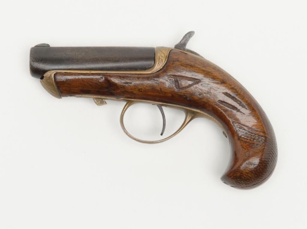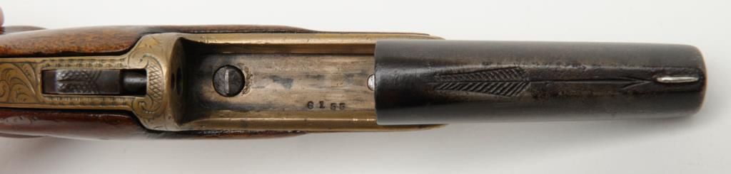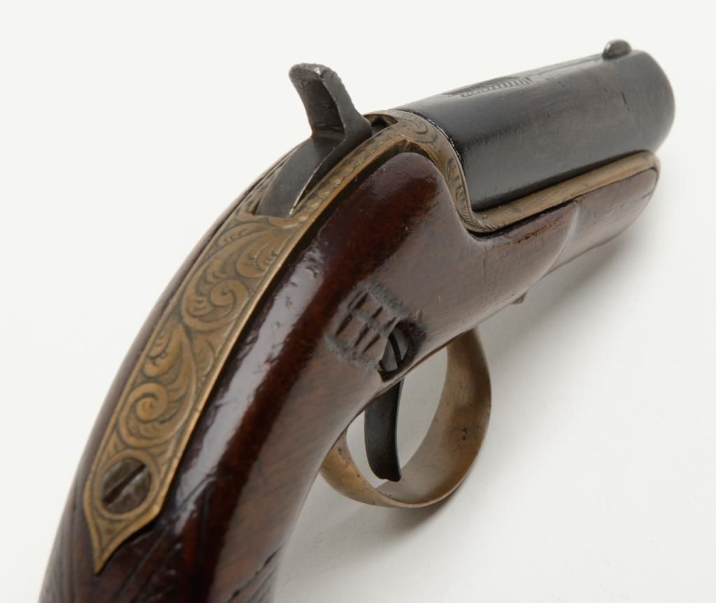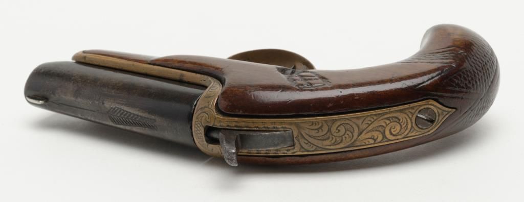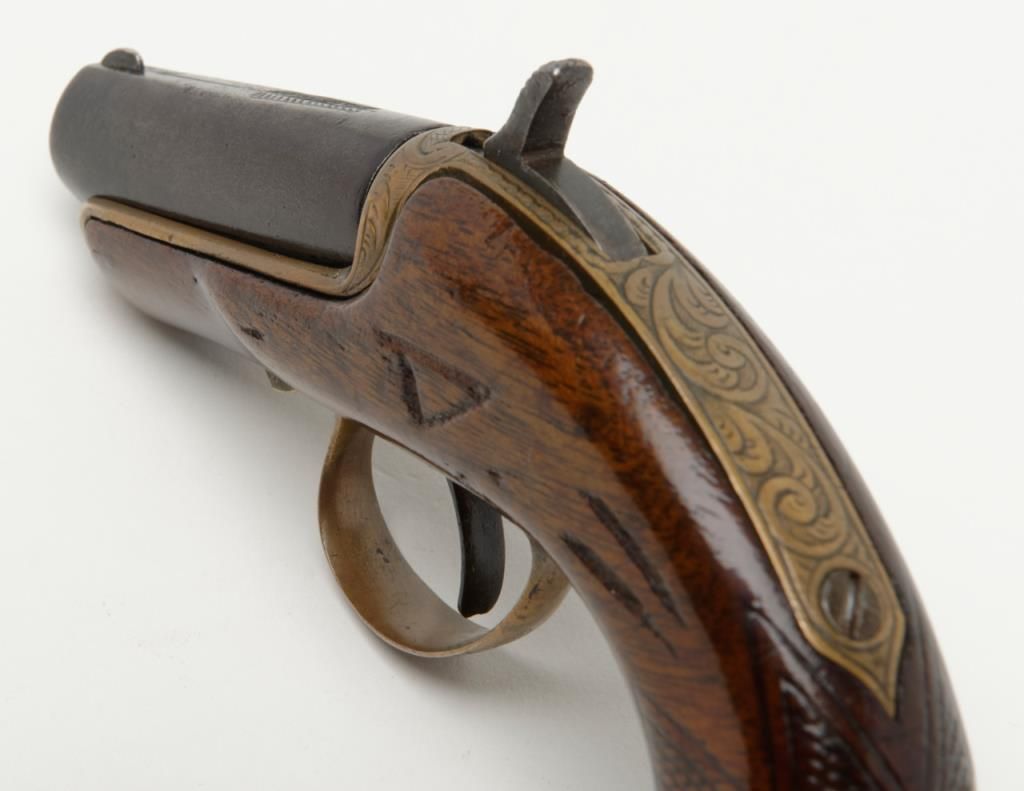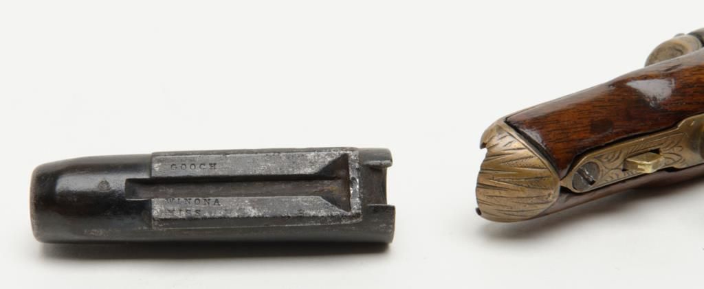 Gooch, Winona, Miss.-marked single shot derringer (before the Williamson deringer), .41 cal., 2-1/2” barrel, blue finish, brass frame and trigger guard, wood stock, #6133 in overall good to very good condition showing a dark patina, fair bore,crisp action, sharp markings on underside of barrel, good to very good grips with old carved A and two hash marks on left side of wrist and old added carved checkering panel on right side of wrist above hammer screw; a desirable Southernmaker-marking and popular collector derringer. (Antique). Est.: $600-$1,200.