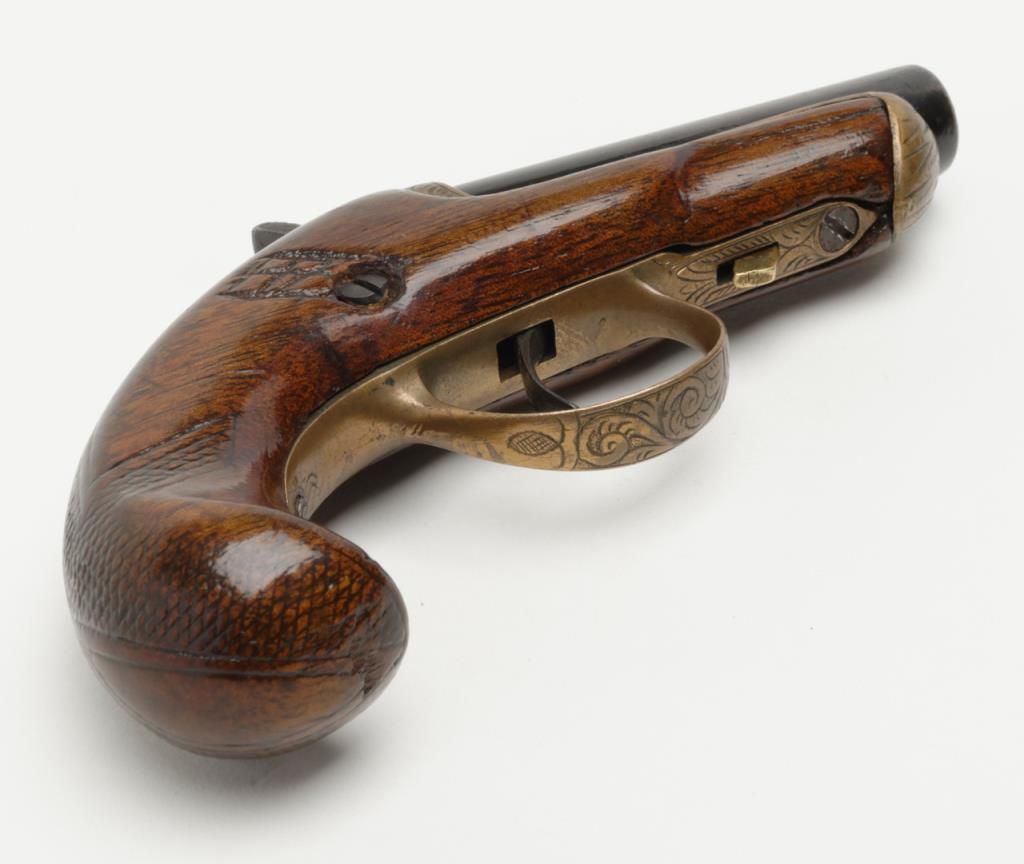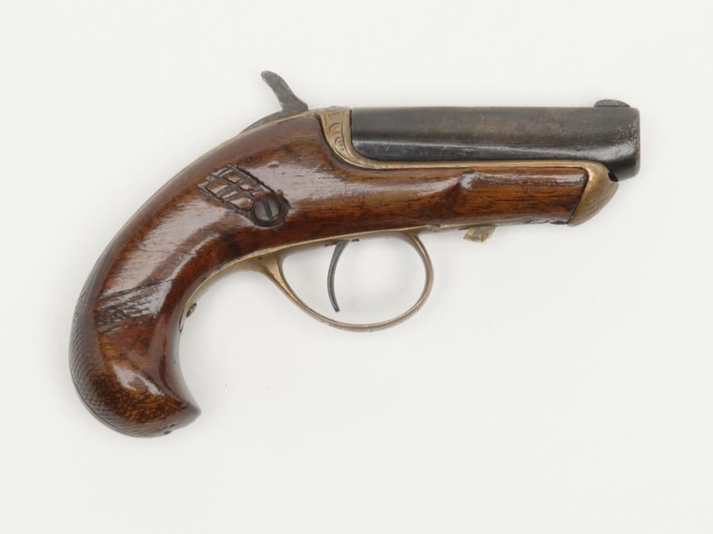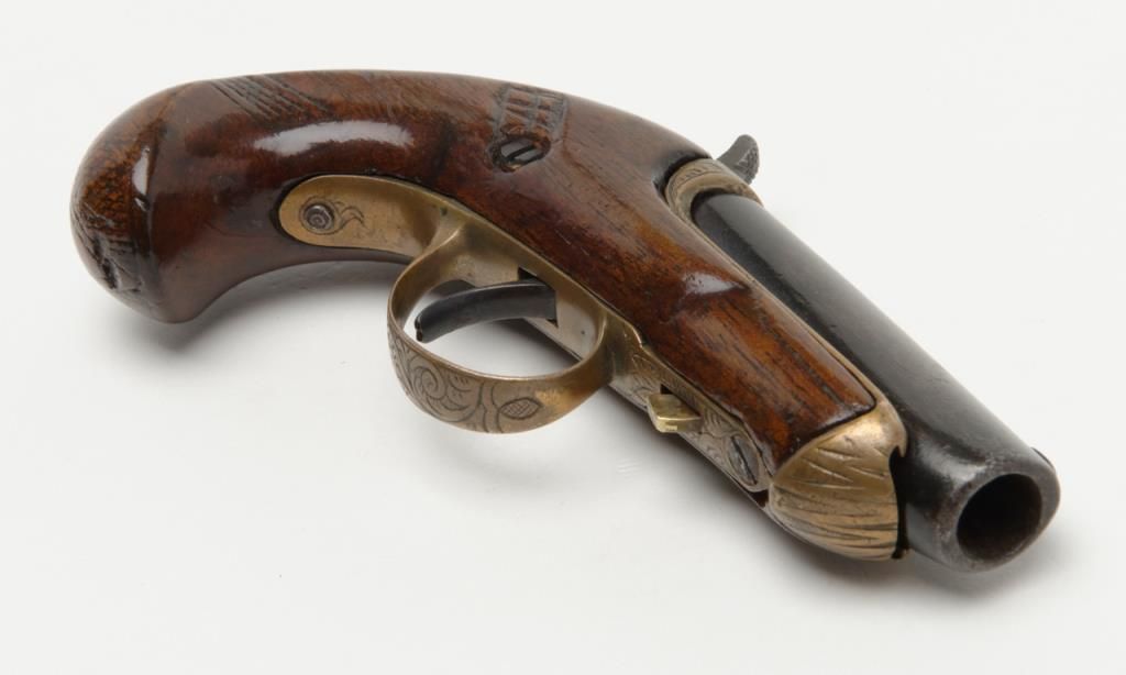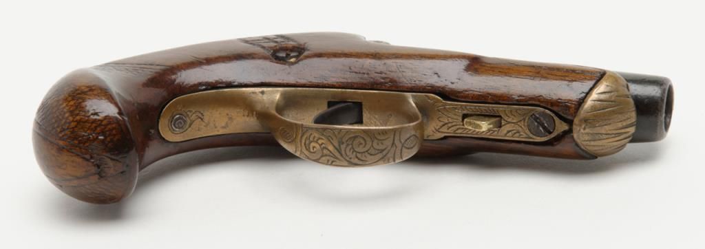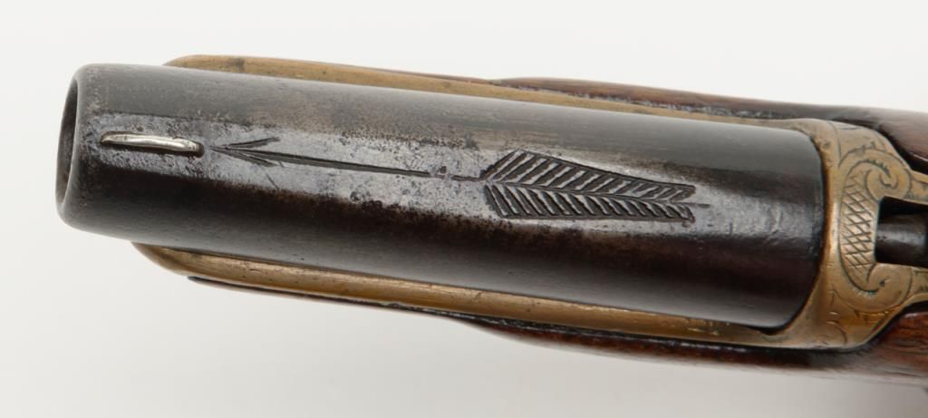 Gooch, Winona, Miss.-marked single shot derringer (before the Williamson deringer), .41 cal., 2-1/2” barrel, blue finish, brass frame and trigger guard, wood stock, #6133 in overall good to very good condition showing a dark patina, fair bore,crisp action, sharp markings on underside of barrel, good to very good grips with old carved A and two hash marks on left side of wrist and old added carved checkering panel on right side of wrist above hammer screw; a desirable Southernmaker-marking and popular collector derringer. (Antique). Est.: $600-$1,200.