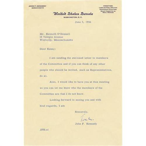 <B>Good Association John F. Kennedy Typed Letter Signed</B></I> on U.S. Senate, one page, 6.25" 9.25", June 5, 1956, to his future special Assistant Kenneth O'Donnell. In part: "<I>I am sending the enclosed letter to members of the Committee and if you can think of any other people who should be invited... do so... I would like to have you at this meeting so you can let me know who the members of the Committee are that I do not know.</B></I>" Kennedy is likely referring to the Senate Select Committee to Investigate Improper Activities in Labor-Management Relations, to which O'Donnell had recently been appointed as Assistant Counsel. Signed "<I>Jack</B></I>", the letter has tiny staple holes at top left corner and is in near fine condition.<BR><BR><b>Shipping:</b> Flat Material, Small (<a target="_blank" href="http://www.heritageauctions.com/common/shipping.php">view shipping information</a>)