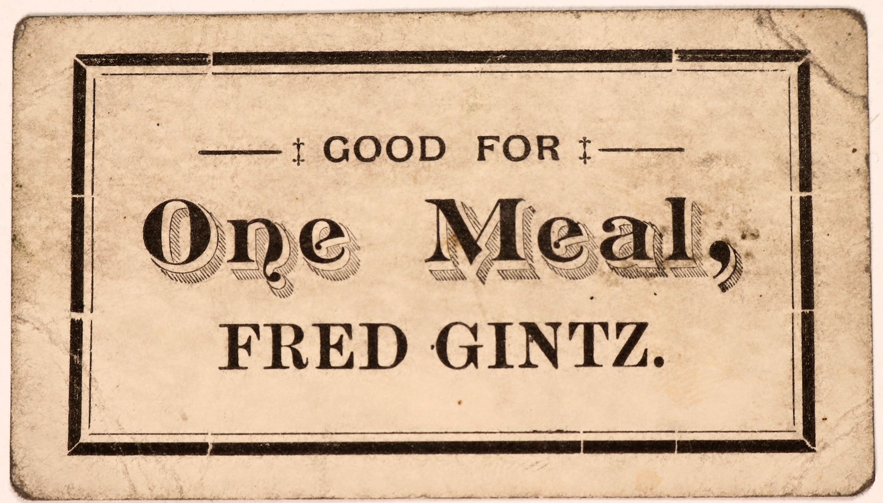 A paper token from Canton, Ohio, from about the 1920s. GOOD FOR/One Meal,/FRED GINTZ. Printed in black on white paper, with border, 3" x 1.75".