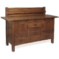 Good L & JG Stickley sideboard, #731, large overhanging top above two paneled cabinet doors with original copper strap hardware flanking four half drawers over one full drawer, plate rail at back, signed with Handcraft decal, fine original finish, 72”w x 25”d x 50”h, excellent condition