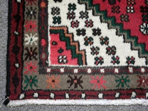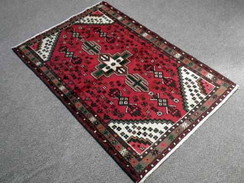Good-looking hand woven fine quality Persian Hamedan. It's made of fine quality lamb's wool pile on cotton foundation using all natural vegetable dye. The contrast between rich red and white color make everyone to stop by this piece and appreciate the fascinating design of its artist. The central medallion matches the color of the corner compositions and goes perfectly with the background. The unique mixture of the floral and geometrical design in the center and sides of this Rug makes it a rare masterpiece of our collection. Size: 3 feet 5 inches X 5 feet.