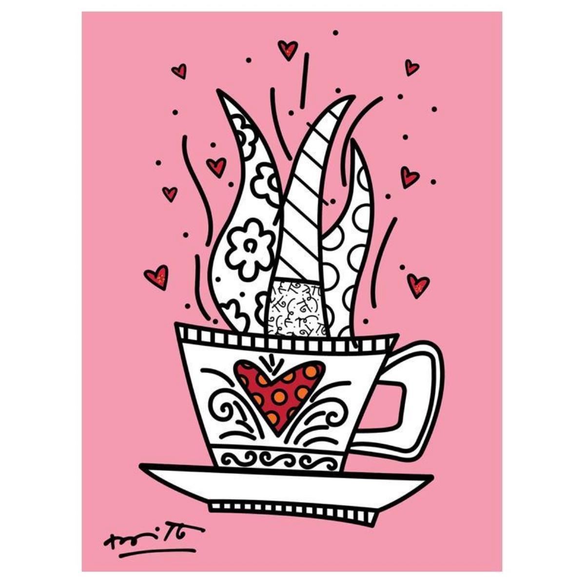 "Good Morning (Pink)" is a limited edition giclee on canvas with diamon dust embellishments by Romero Britto. The piece is numbered, hand signed by the artist, and authenticated with the official Britto hologram. Measures approximately: 12" x 9".