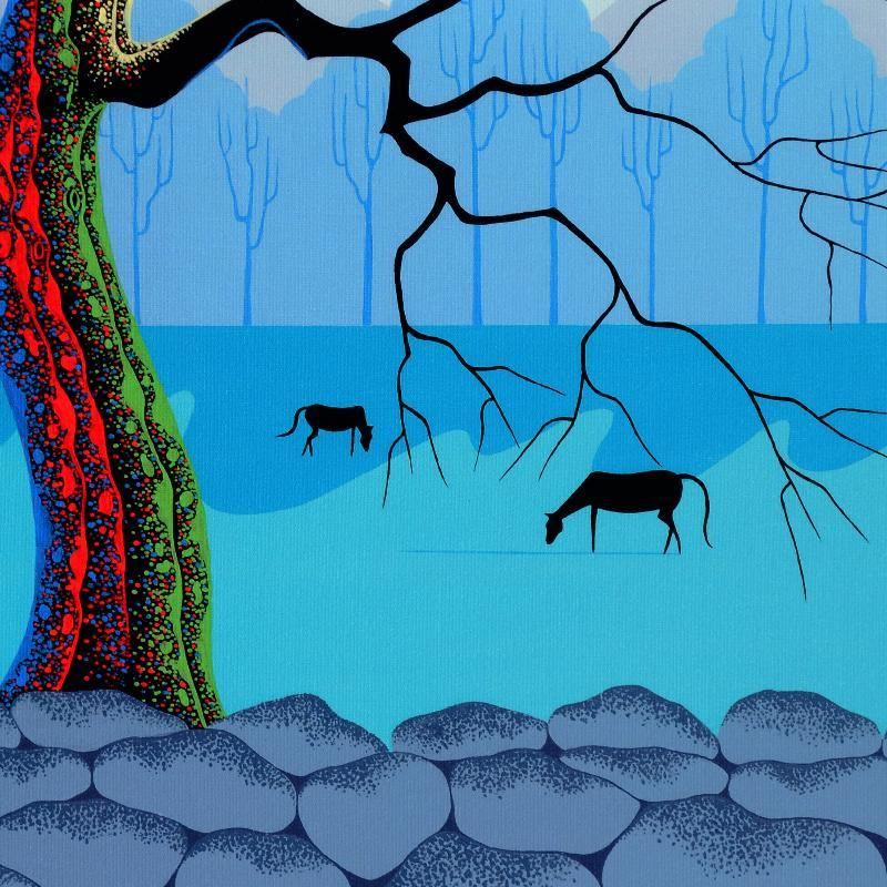 Larissa Holt, a student of distinguished artist Eyvind Earle(1916-2000), uses bold colors and breathtaking scenery to create images of Nature in her own unique style. "Good Neighbors" is a limited edition giclee on stretched canvas by Holt, numbered and bearing Holt's authorized signature. This piece comes gallery wrapped. Includes Certificate of Authenticity! Measures approx. 10" x 12.5" x 1.5" (image).