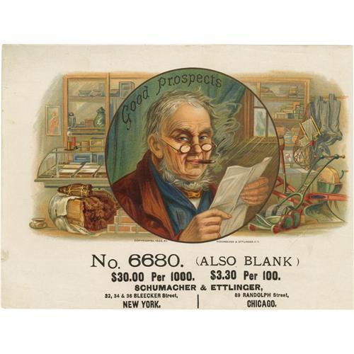 <B><I>Good Prospects</B></I></B></I><B> Sample Cigar Label by Schumacher & Ettlinger, New York.</B></I> Full color lithographed 8" x 6" inner label copyrighted 1886. A large, central medallion shows Horace Greely's double enjoying a cheroot while examining a healthy balance sheet. A background illustration displays the contents of a general store. One glass case contains cigars, of course. Minor staining on left margin, else excellent condition.<BR><BR><b>Shipping:</b> Small Flat (<a target="_blank" href="http://www.heritageauctions.com/common/shipping.php">view shipping information</a>)