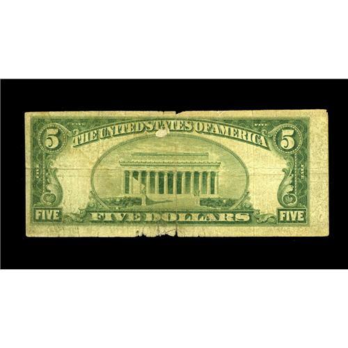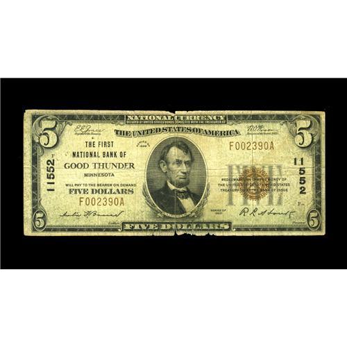 <B>Good Thunder, MN</B></I> - $5 1929 Ty. 1 <B>The First NB</B></I> Ch. # 11552<BR>The ever popular title is represented here by a note that is as heavily circulated as its other surviving counterparts. While the note appears to be Fine, a tear and edge problems preclude it from that grade. <B>Good-Very Good.</B></I>