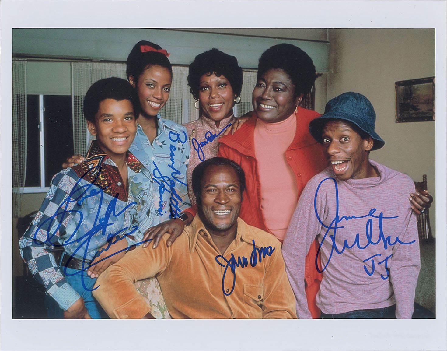 Color satin-finish 14 x 11 photo of the cast of Good Times, signed in blue felt tip by John Amos, Jimmie Walker, who adds "JJ," Ja'net Dubois, Bern Nadette Stanis, and Ralph Carter. In fine condition.