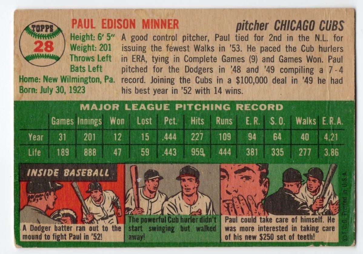 Good Vintage Card Paul Minner 1954 Topps Card number 28