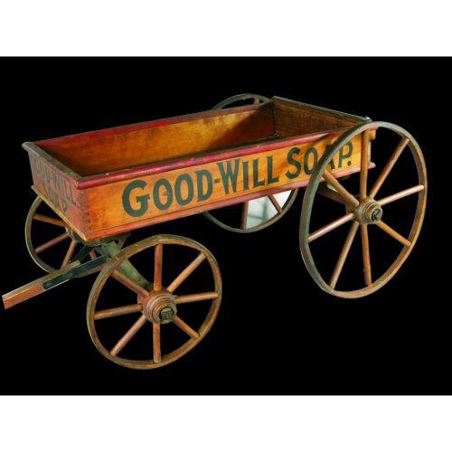 Good-Will Soap Childs Wagon, with wood spoke wheels and original stenciling. Excellent original condition. 20 inches wide X 32 inches long without handle.