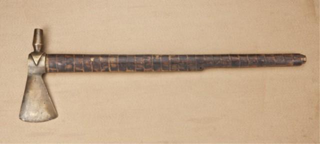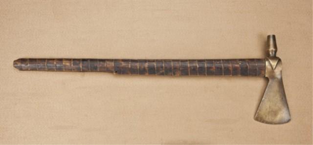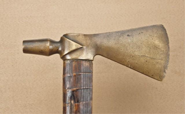 Good cast naval brass-headed piped tomahawk with attractive original burnt file decorated stem, early to mid 19th century. The head measures 8-3/8” from the tip of the blade to the tip of the bowl and approx. 3-3/8” across the widest portion of the blade. The head shows a dark uncleaned patina finish, and the inside of the bowl shows smoking. The head shows good wear at the edges, carry, and use. The head is mounted on its original shaft, which is in very good plus to near fine condition showing some smoking, carry and use. The shaft measures 24-1/2” in length and nearly 1-5/8” across widest part of body. The hole for ornaments is correctly drilled, and the shaft shows some small losses and normal aging, but is very good plus to near fine overall. A great looking tomahawk that has had no modern reworking and is the way that collectors like to see them with a proper patina around the shaft and head where they meet. From the William R. Orbelo Collection. Est: $7,000 - $14,000