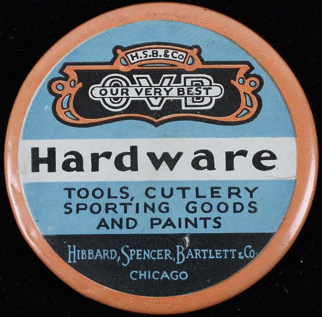 Good early celluloid adv. pocket mirror, for Our Very Best Hardware, 2" diameter in very good condition. Est. 25-75