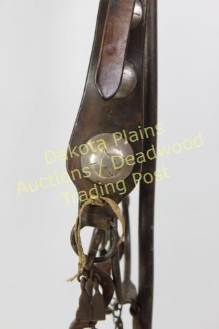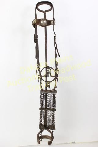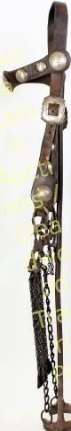 Good early leather Navajo bridledecorated with engraved sterling silver conchos and buckles, fitted with impressive ring bit that remains complete including rein chains and jingles. Excellent untouched condition with NO repairs. Est. 800-1500