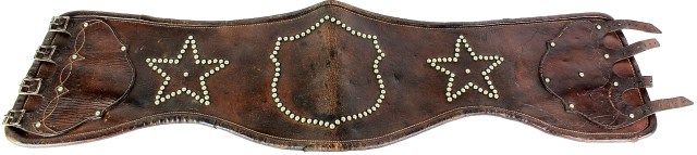 unmarked, canvas lined, original stars and shield spotted design, outer perimeter bound in rolled leather. Buckles and straps intact, leather supple with sound stitching. Est. 375-600