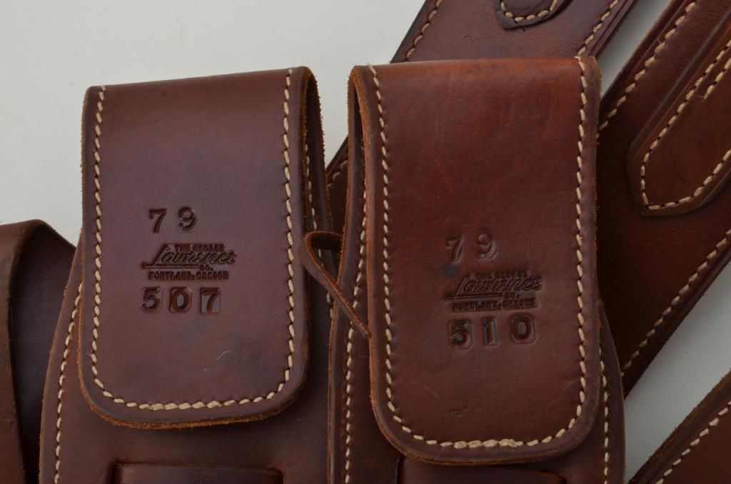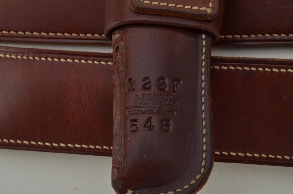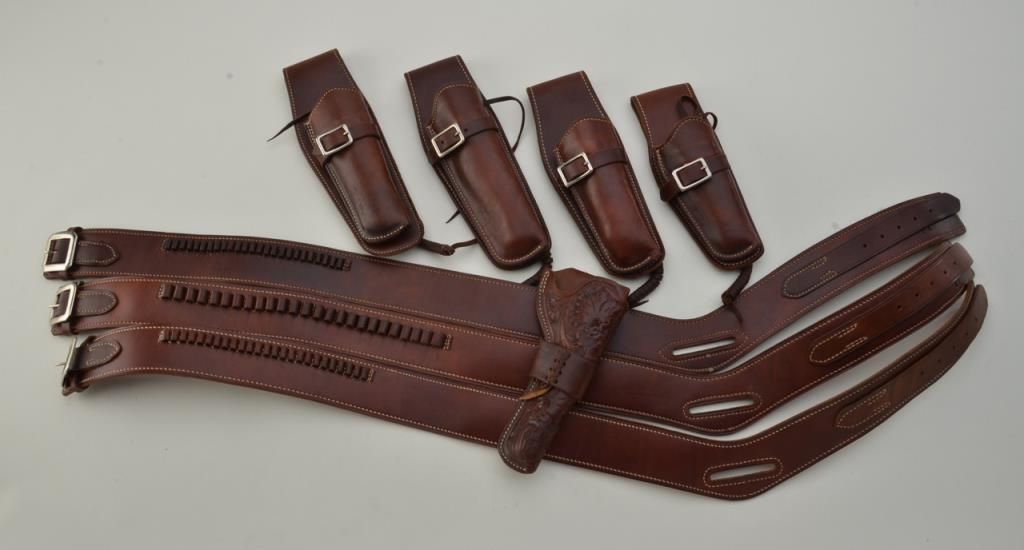 Good lot consisting of 4 George Lawrence marked plain leather holsters for Colt single actions and 1 carved George Lawrence holster marked also for Colt single action or scouts. Along with 3 George Lawrence cartridge belts, 2 in .22 caliber and 1 in .38 caliber. All are in good to very good condition. 8 pieces total. Est.: $150-$300