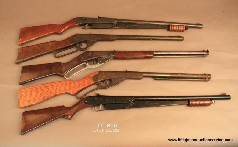Good lot of 5 collectible BB Guns-Daisy model 27 500 shot lever action circa 1927-32 very good condition. Normal aging and use. Daisy model 108 ser. #39 made 1959 only. Fair to good, some rusting. Daisy Red Ryder model 40 - no. 111 ingood condition. Daisy no. 25 pump action good to very good condition. Daisy No. 25 pump action - wood stock- ornamented metal. Very good condition. Est. $300 - $600