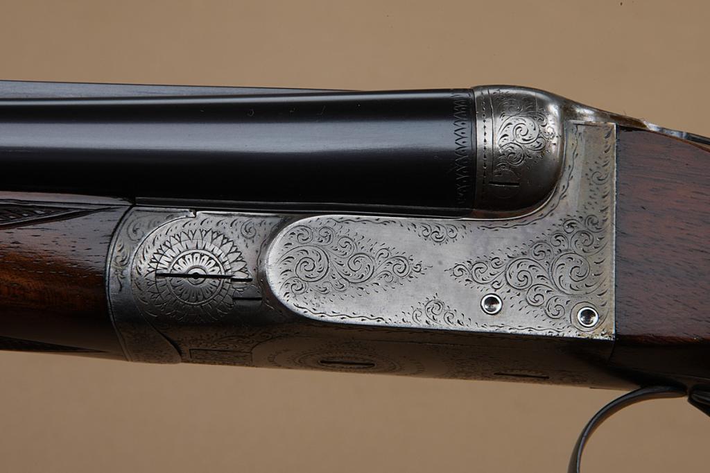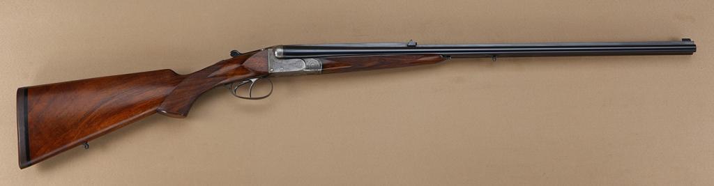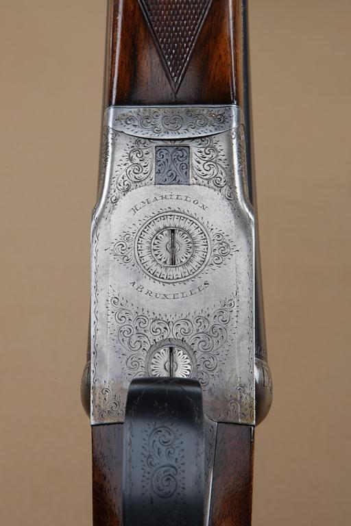 Good quality Belgian boxlock double rifle signed ‘Ancienne Mon H Mahillon of Brussels, makers of arms for royalty’ in French on barrel. The bottom of barrels are marke 9.3x74 and show B. Blindee stamp and Belgianproofs. The rifle is of medium weight showing bushed firing pins, auto ejectors, raised and milled rib, iron sights, blue and case hardened finish, action lightly engraved in scrolls, bottom of frame also signed “H.Mahillon”. The rifle shows 25-3/4” barrels, 42-3/8” overall. Stock measures 14-1/4” to the end of the wood, 15-1/4” to the end of the European type rubber recoil pad. The rifle weighs approx. 6.3lbs and is in verygood plus to near fine condition with 95-98% original blue, typical sedate case hardening, drifting slightly to grey. The triggerguard shows most of its original blue. The stocks are very good plus with crisp checkering,just some minor handling and storage type wear that is minimal. The action is tight, the bores are fine to near excellent and would clean. The rifle has had just some slight use. The rifle is equipped with studs