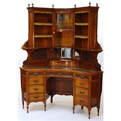 Good quality Edwardian walnut corner writing unit, the superstructure with convex glazed door, flanked on either side by a pair of adjustable shelves over a triple bevelled mirror with a well and urn carved panels either side, the lower part with tooled l