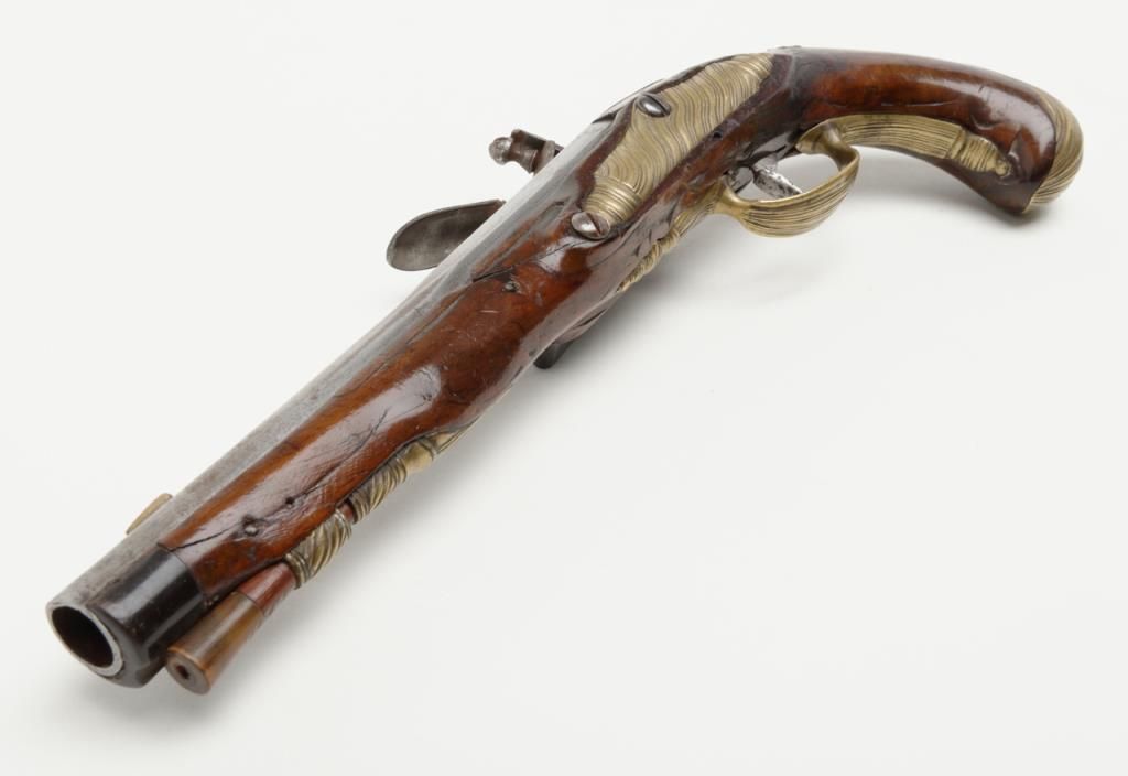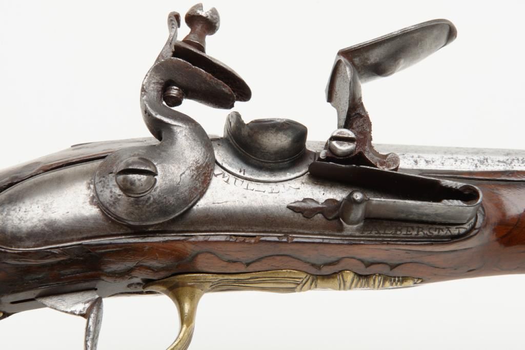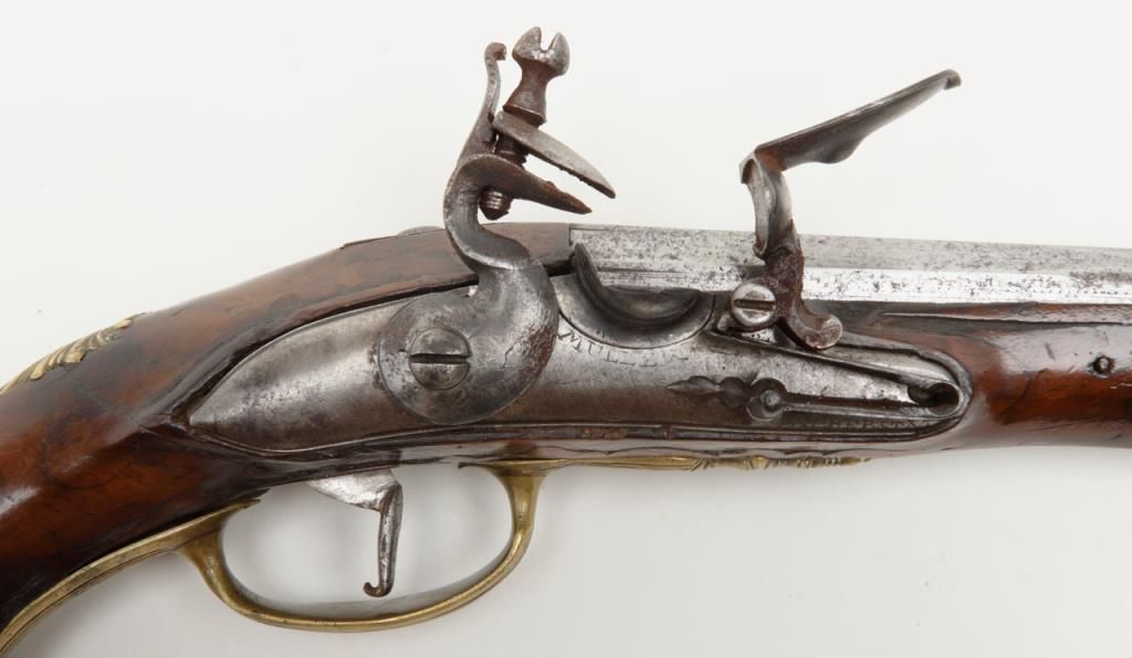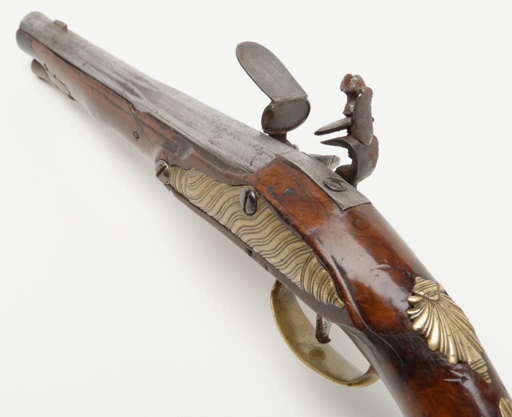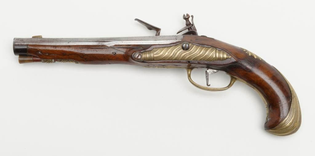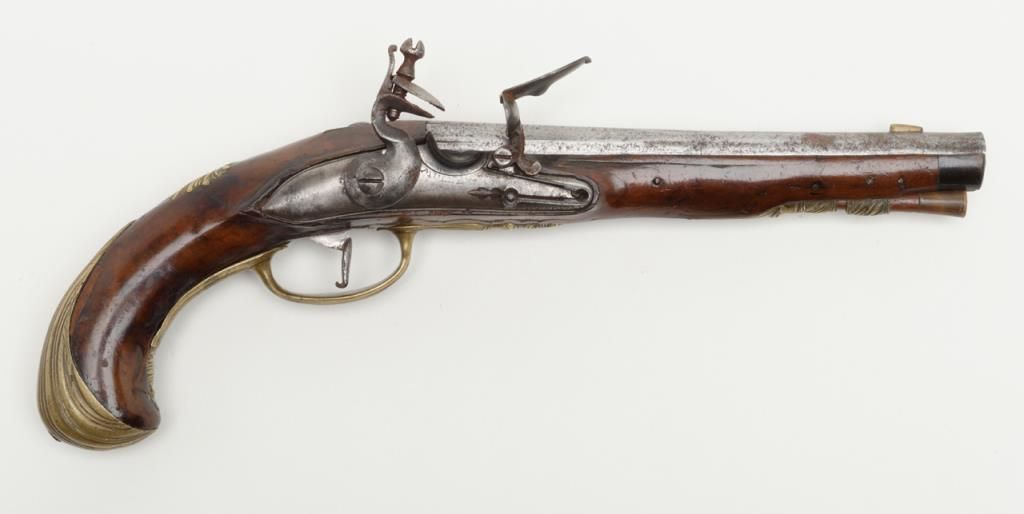 Good quality Germanic flintlock pistol circa 18th century with grooved brass and gilded mounts signed “Mueller” with “Halberstadt” marked beneath the frizzen on the edge. The pistol measures 14 ½” overall with 8 ½” barrel of approximately .54caliber smoothbore. The metal surfaces show some light to moderate erosion and pinprick pitting most of which would clean. The original horn tip ramrod and forend cap are retained. The stock shows a nice burl to the wood and is in good tovery good condition with some small losses, slight scratches and normal aging. The pistol is in its original flintlock configuration with correct hammer, frizzen and small parts. The action is not working and the mainspring has either becomedetached or is broken. A very attractive Germanic pistol that we would date about 1760. Est.: $800-$1600