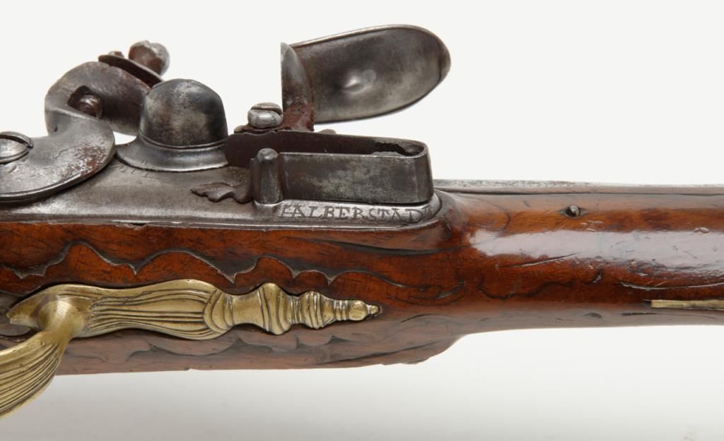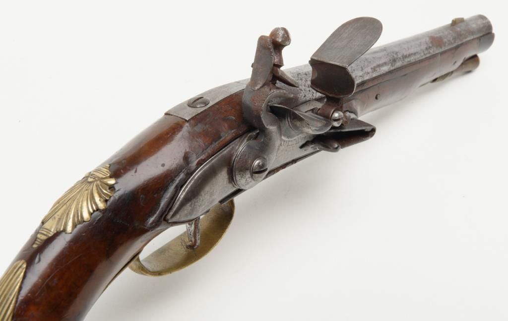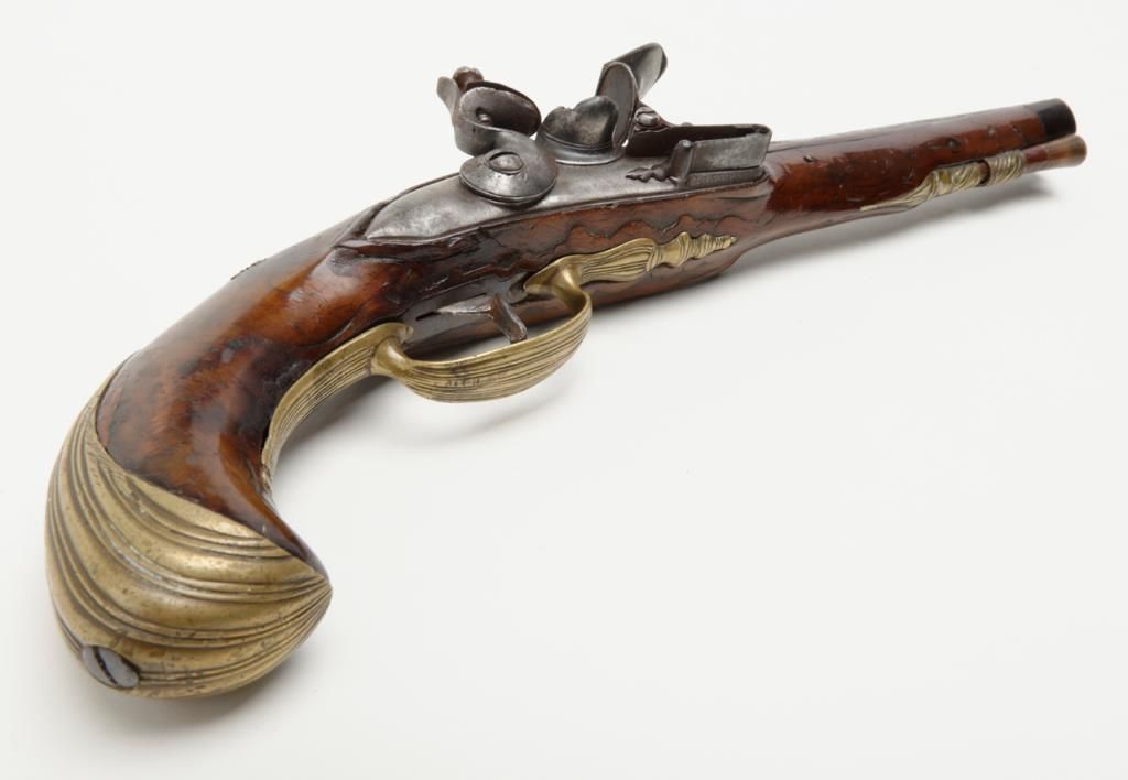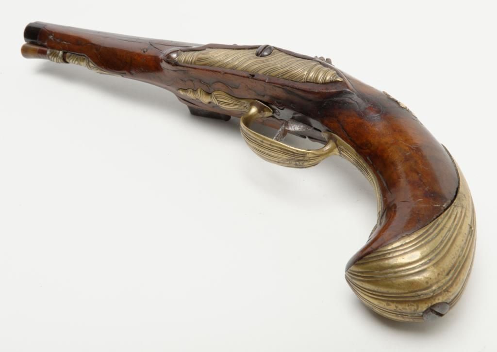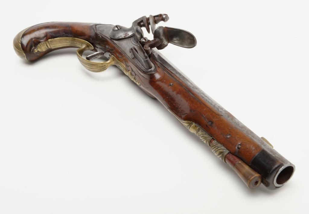 Good quality Germanic flintlock pistol circa 18th century with grooved brass and gilded mounts signed “Mueller” with “Halberstadt” marked beneath the frizzen on the edge. The pistol measures 14 ½” overall with 8 ½” barrel of approximately .54caliber smoothbore. The metal surfaces show some light to moderate erosion and pinprick pitting most of which would clean. The original horn tip ramrod and forend cap are retained. The stock shows a nice burl to the wood and is in good tovery good condition with some small losses, slight scratches and normal aging. The pistol is in its original flintlock configuration with correct hammer, frizzen and small parts. The action is not working and the mainspring has either becomedetached or is broken. A very attractive Germanic pistol that we would date about 1760. Est.: $800-$1600