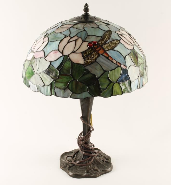 Good quality reproduction lamp with dragonflies and glass shade; approximately 24” in height by 18” in width. Est.: $250-$500.