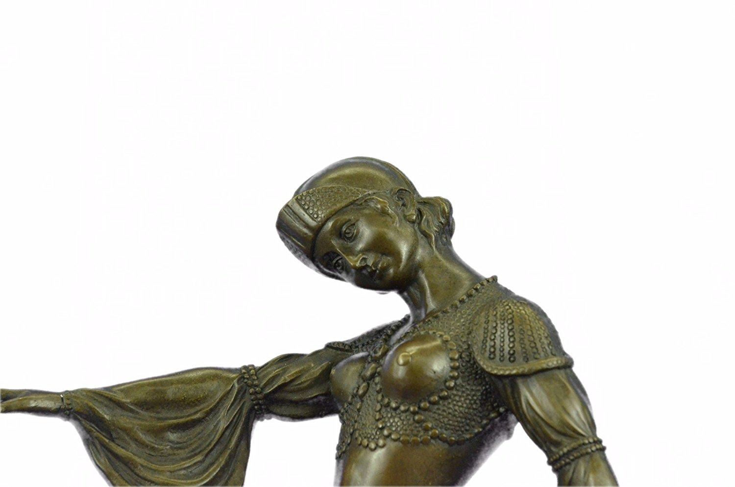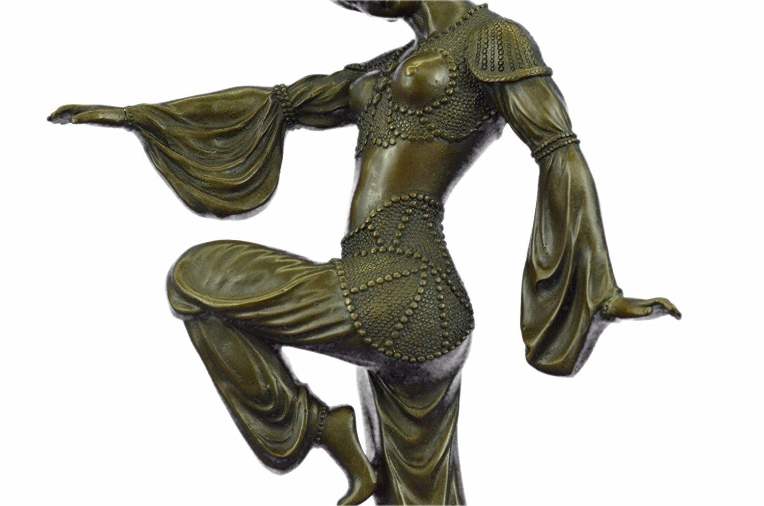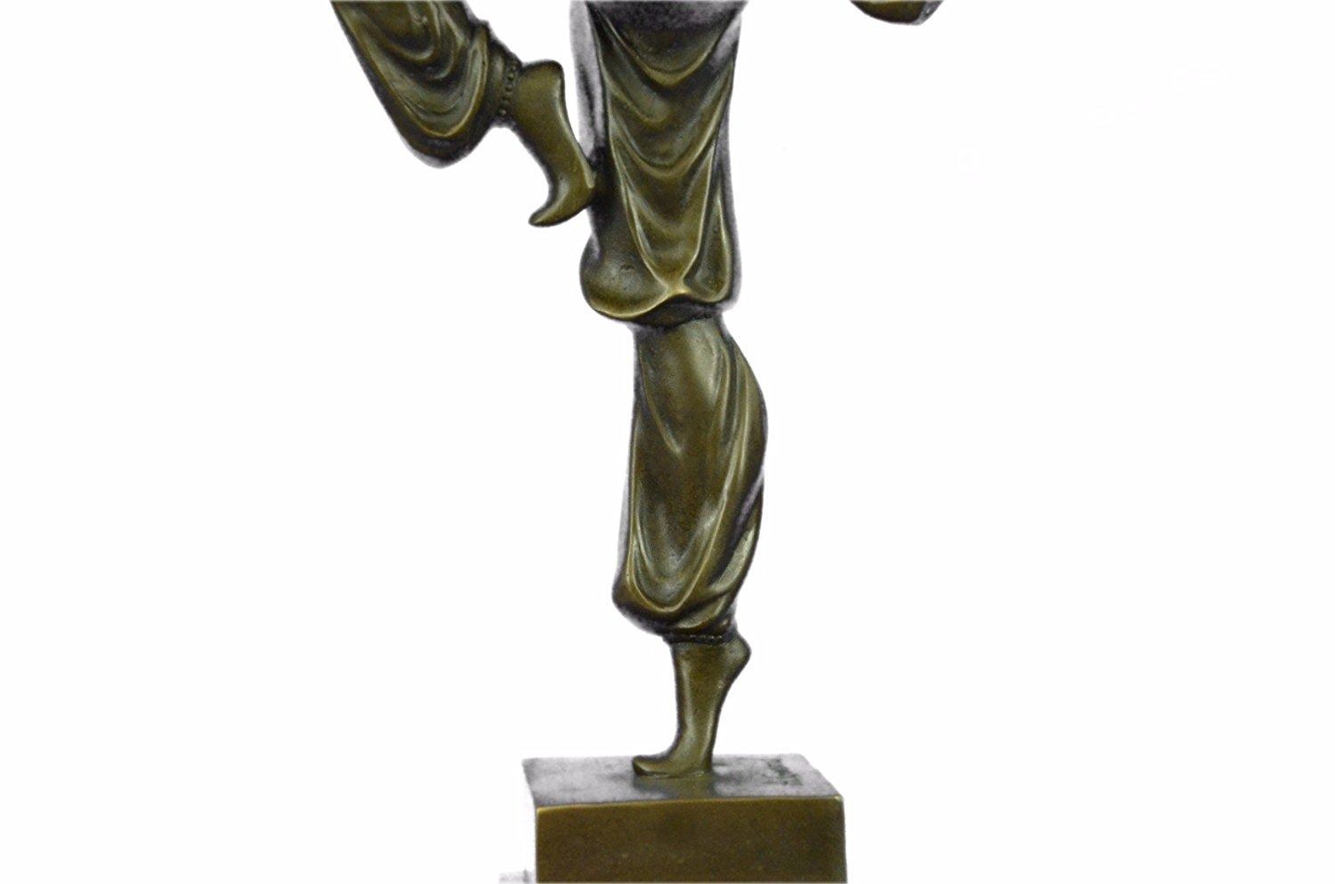 This Stunning Dancer Is One Exquisite Piece. She Stand On Her Toes, While Both Her Arms Are Spread One To The Back Of Her And The Other To The Front . She Is Wearing Earrings And A Stylish NeckLace To Go With Her Ankle Bracelets. Her Gorgeous Seashells Style Top With This Astonishing Skirt That Dangles Little Cute Circular Beads Up Front, She Is Also Wearing A Gorgeous Hat That Covers Most Of Her Head And Hair. She Stands At The End Of Her Performance Proudly And Excited About Her Grand Finale. The Feed Back She Gets From The Crowd Leaves Her Well Pleased And Delighted This Amazing Sculpture Is In A Brown Patina And Mounted On A Marble Fire Red Colored Base. 100% Bronze And Handmade, She Was Cast Using The Lost Wax Method. Bronze Dimensions with Marble Base: Height 20 X Width 10 inches. Weight: 15 LBS.