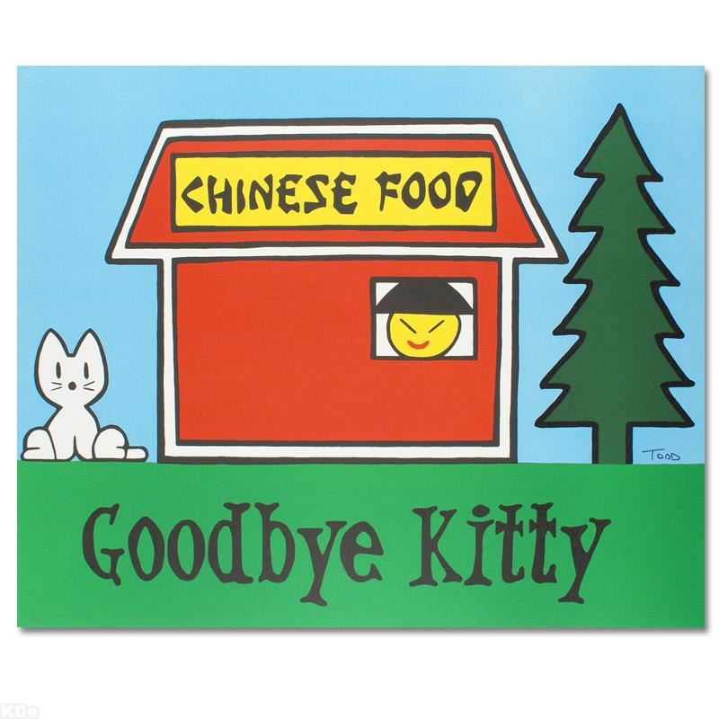 Pop artist Todd Goldman is known all across the globe for his whip-smart and wickedly funny puns and pictures! "Goodbye Kitty" is a limited edition lithograph on paper, numbered and hand signed by Todd. Includes Certificate of Authenticity! Measures approx. 37" x 30" (no border).