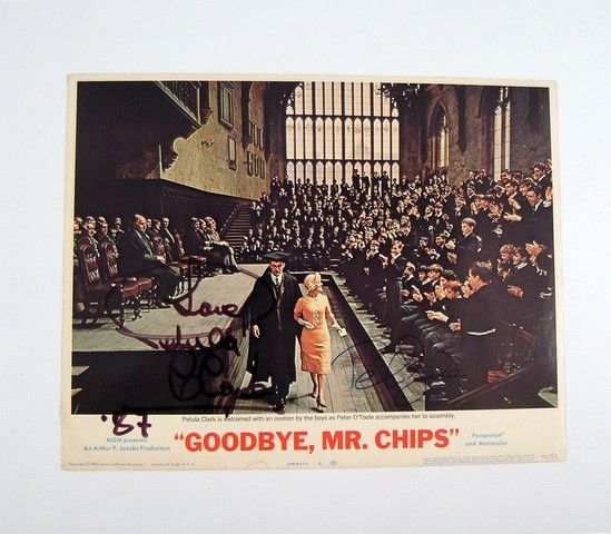 Goodbye, Mr. Chips (1969) Original Lobby Card Signed By Peter O'Toole & Petula Clark MGM musical's really went out with a roar with a magnificent remake of the classic "Goodbye Mr. Chips" in 1969. Based on the truly astonishing 1939 multi-Oscar winner original movie with Robert Donat and Greer Garson, the remake was turned into a musical starring Peter O'Toole and Petula Clark. Beautifully mounted, it was the last of type of films that MGM used to produce in its glory days. This is an original Lobby Card showing the emotionally charged sequences where the students give O'Toole's rather unorthodox wife, Petula Clark, a standing ovation at assembly. It is personally autographed by both Peter O'Toole and Petula Clark. A rare collectable. Lobby Card is 14"x11".
