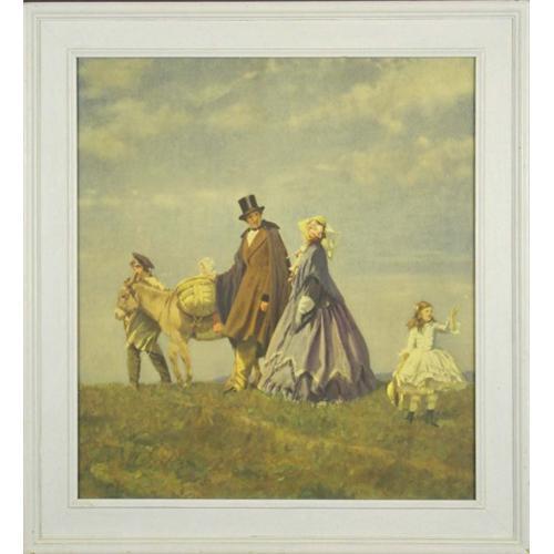 This is exquisitely depicted scene. The characters all have different expressions making them unique and giving them individuality. The sunlight is casting sharp shadows that really give depth to the people. The viewer?s eyes are instantly drawn to the woman wearing a purple dress that stands out in contrast to the surrounding earth tones. This picture has an almost impressionistic feel to it, and clearly communicates the heat from the sun that the characters have to squint because of its brightness. The print itself measures 21? x 19? and is well framed in a white wood frame that give the supports the old style of the picture. The entire piece, including frame, measures 26.5? x 24.5?.