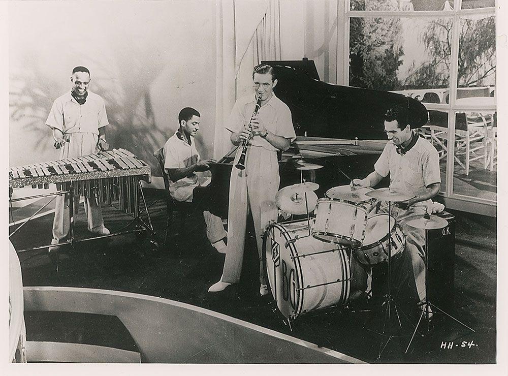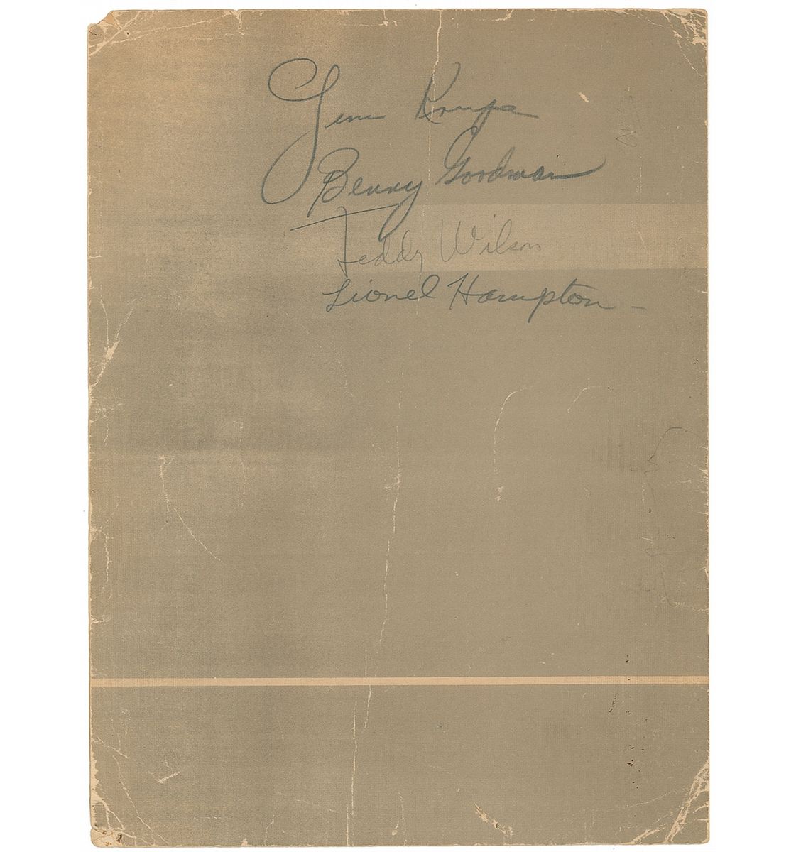 Vintage menu from the Mad Hattan Room in New York’s Hotel Pennsylvania, 9 x 12, signed on the back cover in pencil by Gene Krupa, Benny Goodman, Teddy Wilson, and Lionel Hampton. In very good condition, with a central vertical crease passing through a single letter of three signatures, scattered other creases, and expected handling wear. Accompanied by an unsigned glossy 10 x 8 photo of the four performing together.