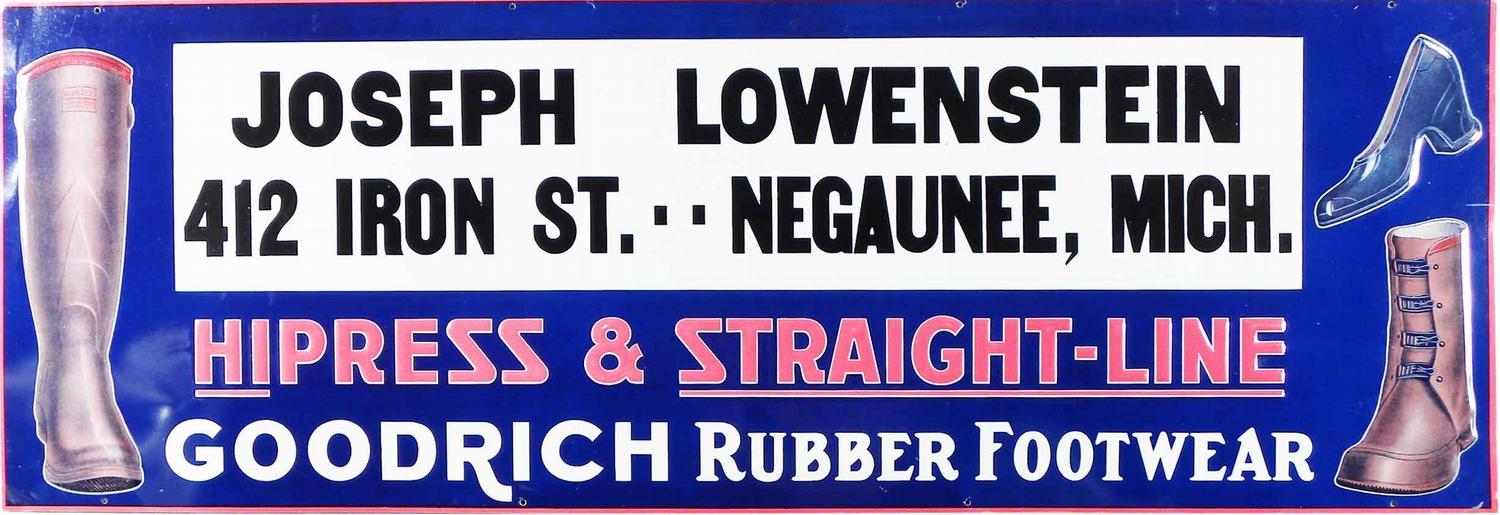 Goodrich Rubber Footwear Embossed Tin Sign. Joseph Lowenstein, Negaunee, Mich. Excellent condition. 39 1/2 X 13 3/4 inches.