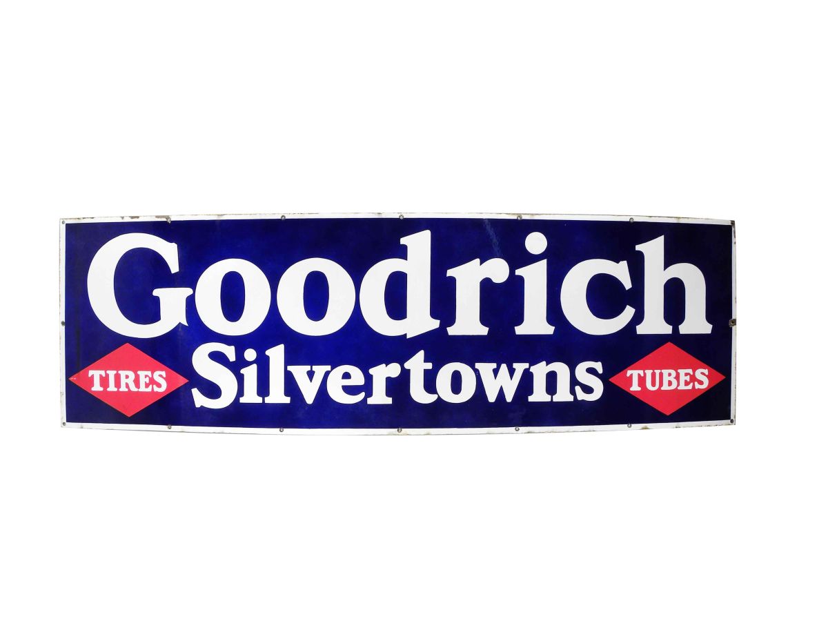 Goodrich Silvertowns Porcelain Tires and Tubes Sign. A few minor chips around the edges otherwise very good condition. 58 X 18 inches.