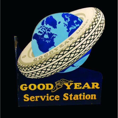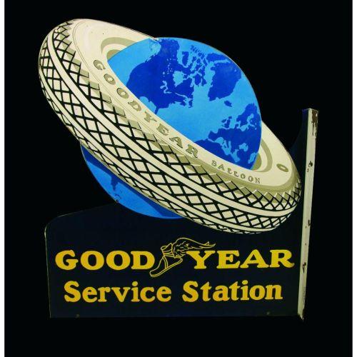 Goodyear Service Station die cut porcelain two sides flange sign. Great Colors. Excellent original condition. 26 x30 inches.