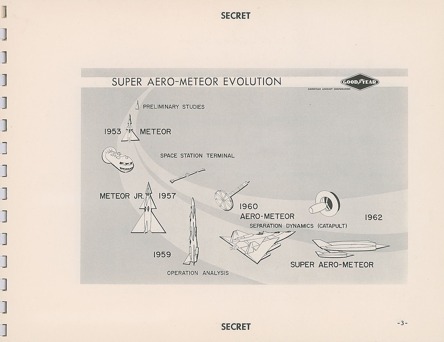 Uncommon spiral-bound Goodyear Aircraft Corporation booklet entitled "Concept for Super Aero-Meteor: HTOL Continuously Reusable Aero-Spacecraft System," dated July 18, 1962, issued as Copy No. 21, 33 pages, 11.25 x 8.75; front and back covers labeled "Confidential," with covers and interior pages marked "Secret." Title page bears a stamp noting that the booklet was declassified on December 31, 1970. A portion of the introduction reads: "Goodyear Aircraft Corporation presents a feasible approach to the earliest development of manned, continuously reusable vehicles as a carrier system to transport men and materials to and from orbit on a practical operational basis. Implicit in manned space flight is the requirement that the vehicle be capable of re-entry and recovery. Goodyear Aircraft's approach, based on METEOR studies over the past decade, extends re-entry and control to manned booster phases. This concept is SUPER AERO-METEOR (SAM). It employs two manned aircraft-type vehicles—tanker and orbital—powered with combined turbo-ramjet and rocket engines." In very good to fine condition, with notable wear and paper loss to covers.
