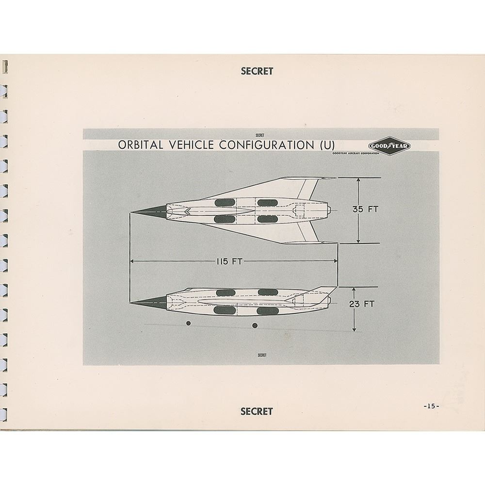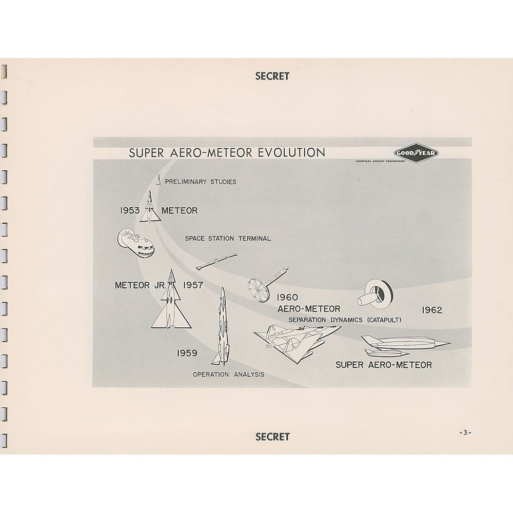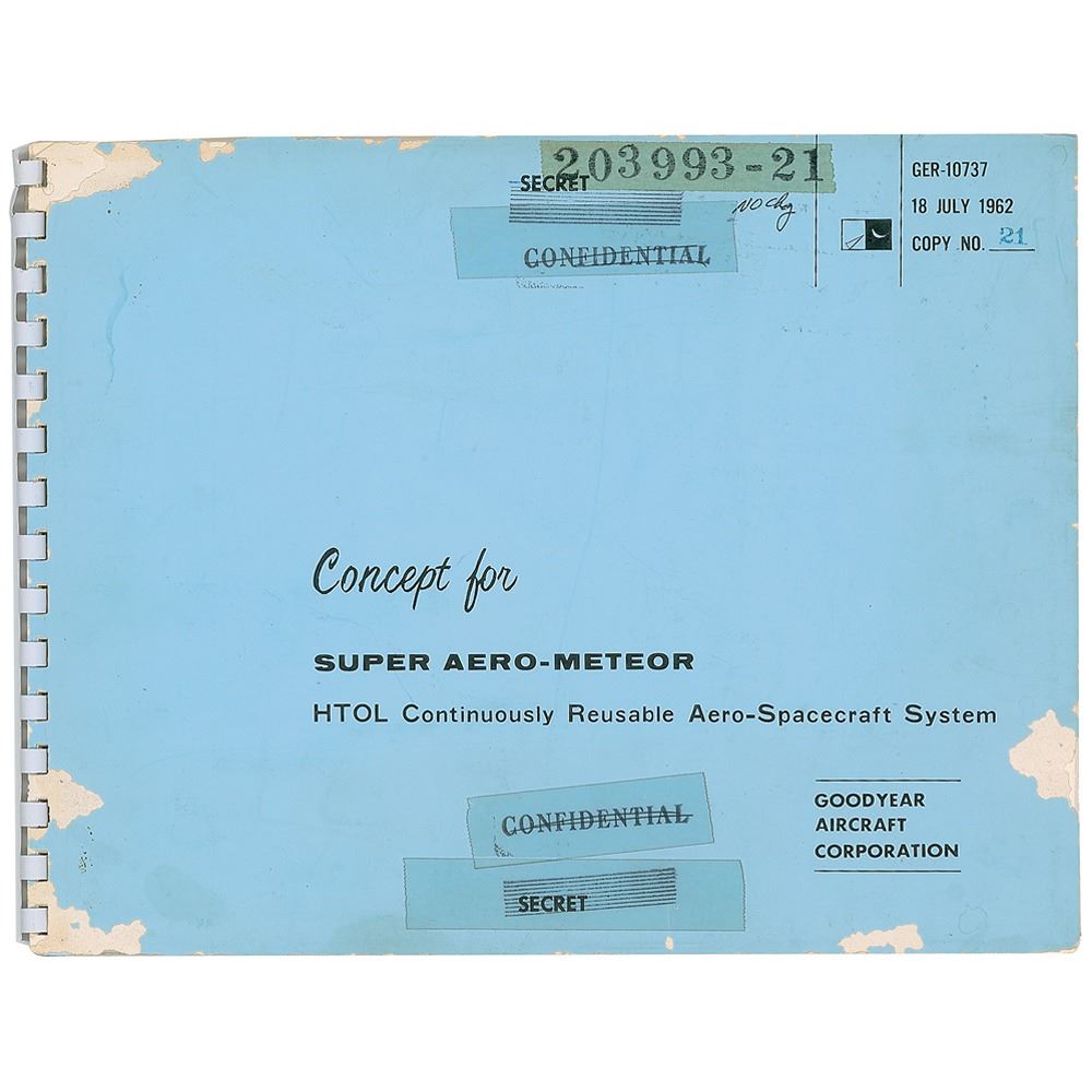 Uncommon spiral-bound Goodyear Aircraft Corporation booklet entitled "Concept for Super Aero-Meteor: HTOL Continuously Reusable Aero-Spacecraft System," dated July 18, 1962, issued as Copy No. 21, 33 pages, 11.25 x 8.75; front and back covers labeled "Confidential," with covers and interior pages marked "Secret." Title page bears a stamp noting that the booklet was declassified on December 31, 1970. A portion of the introduction reads: "Goodyear Aircraft Corporation presents a feasible approach to the earliest development of manned, continuously reusable vehicles as a carrier system to transport men and materials to and from orbit on a practical operational basis. Implicit in manned space flight is the requirement that the vehicle be capable of re-entry and recovery. Goodyear Aircraft's approach, based on METEOR studies over the past decade, extends re-entry and control to manned booster phases. This concept is SUPER AERO-METEOR (SAM). It employs two manned aircraft-type vehicles—tanker and orbital—powered with combined turbo-ramjet and rocket engines." In very good to fine condition, with notable wear and paper loss to covers.