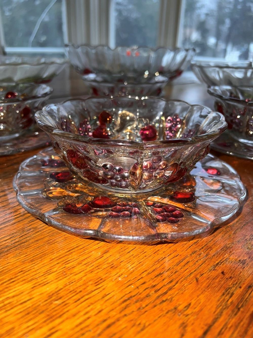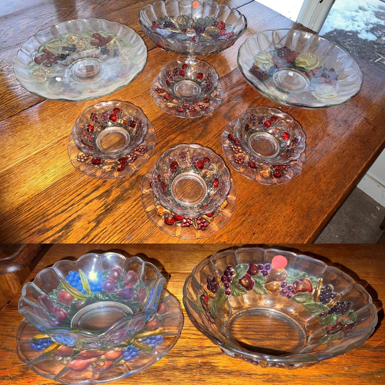 2 center bowls, berry set including 4 bowls and 4 plates and a large serving bowl. Goofus glass bowl and matching dish and 1 large bowl. Approx. 13 pieces, from the lifetime collection.