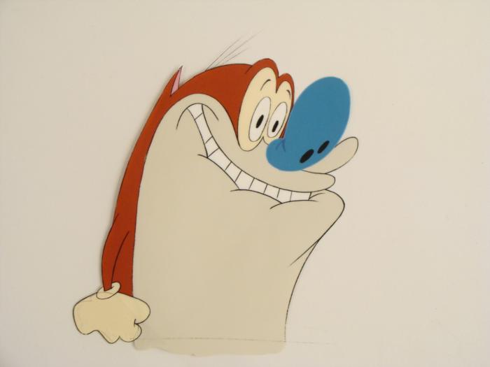 This is an original production animation cel from the Nickelodeon TV show Ren & Stimpy. The show follows two characters - Ren, a crazy Chihuahua - and - Stimpy, an incredibly stupid cat - as they think up to all kinds of hair brained schemes and get themselves into some sticky situations. The Ren and Stimpy Show debuted in August 1991 with a two-part episode, 'Stimpy's Big Day / The Big Shot' and became an instant hit. It was the third Nicktoon ever to be aired on the Network alongside Doug and Rugrats. Stimpy has a goofy faceOriginal Production Art Cel Overall Size of the Cel: 10 1/2" x 1/2" Excellent condition This is an original hand-painted cel set-up used in the production of an episode of "The Ren & Stimpy Show." Each one-of-a-kind set-up represents a slight change in position of the characters. When individually photographed and projected in rapid succession, the images appear to move.
