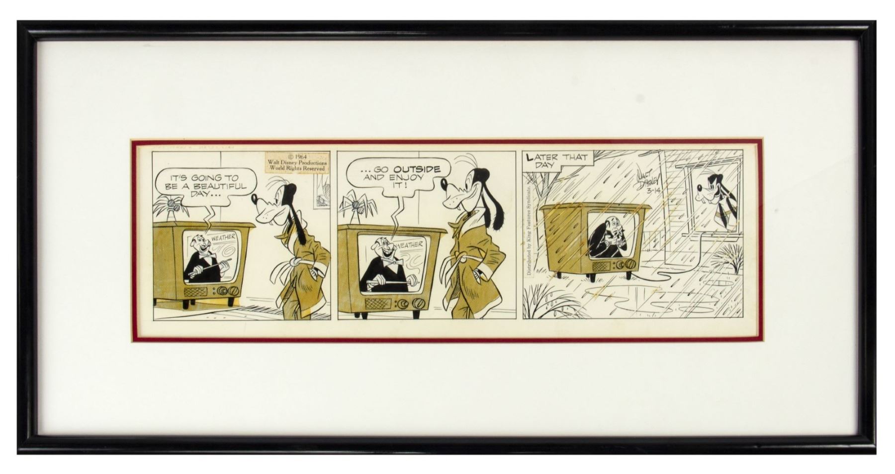 (Disney, 1964) An original hand-drawn and hand-inked comic strip featuring Goofy. Distributed by King Features Syndicate, this comic was originally published in 1964. The artwork has an image size of 5.5"x18.5" within its 13"x26" frame. The condition is very good with some yellowing due to the adhesive used in the creation of the comic strip, which is often expected for comics from this era.