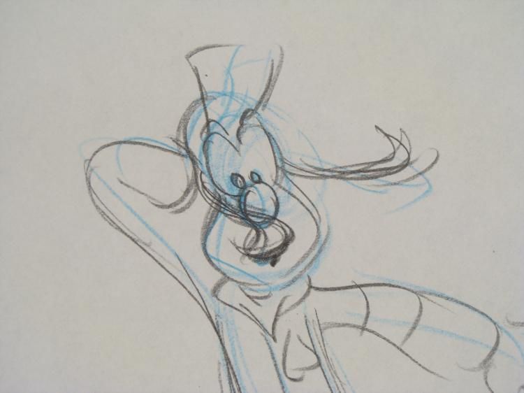 Depicted here is Goofy showing off his dance moves, in this original animation concept drawing. * Medium: Black and non-photo blue pencil on animator's paperSheet size: 10 1/4 x 14 inchesDetails: top and bottom right * Condition: Excellent