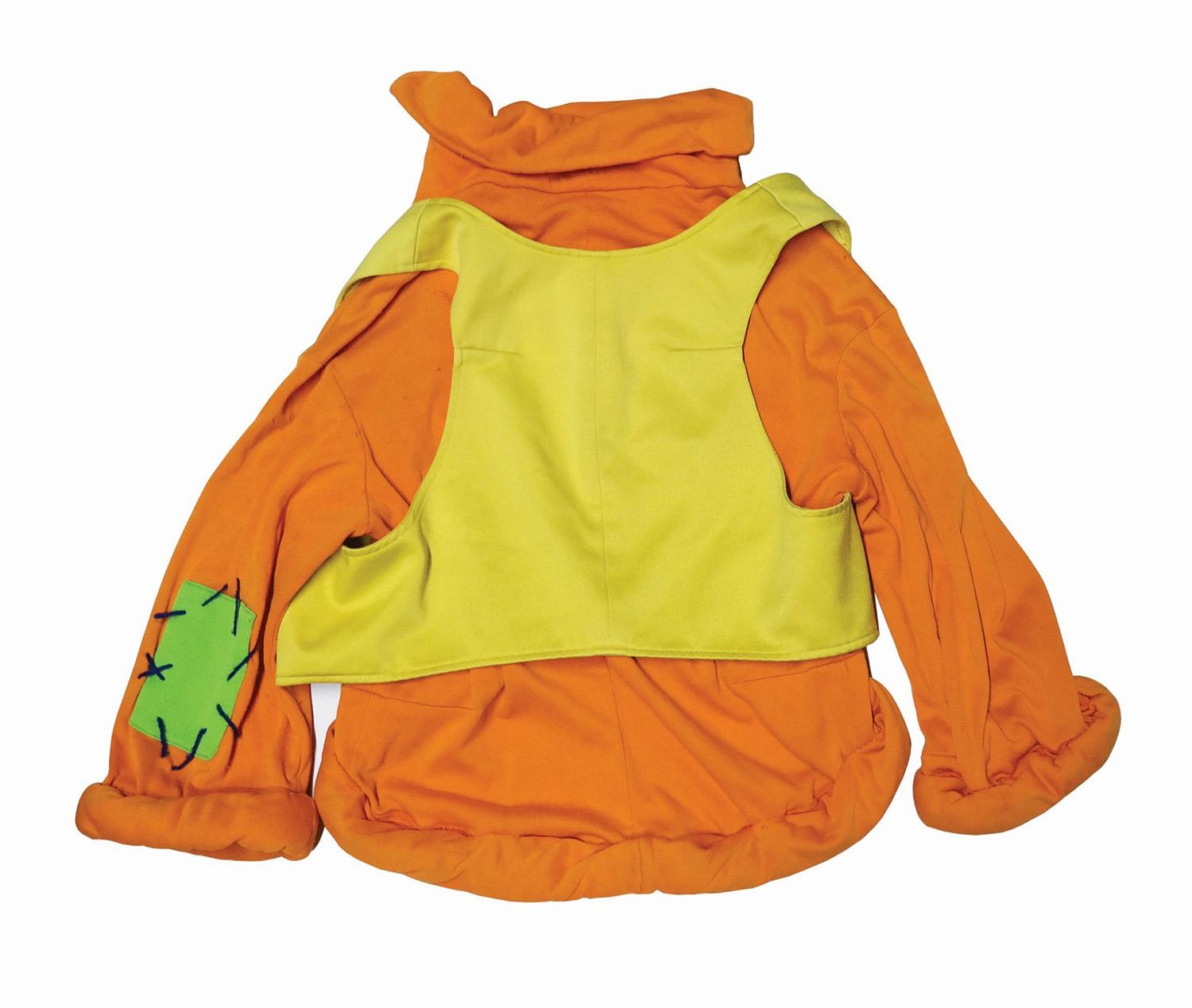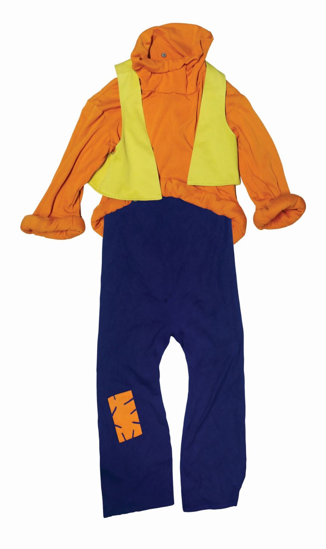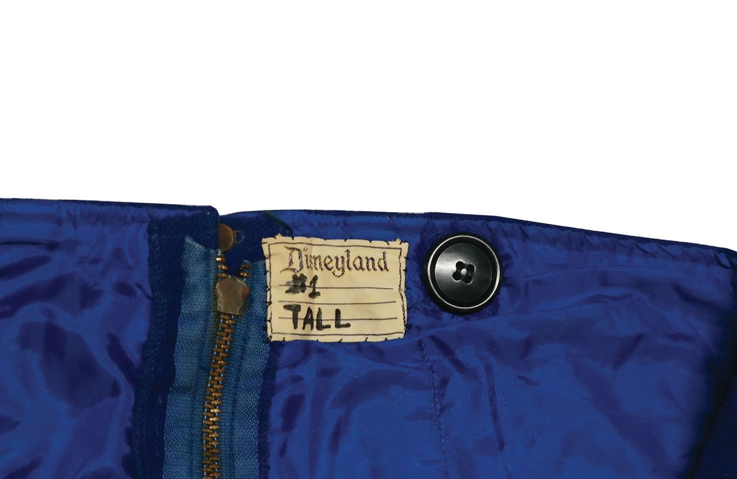 (Disneyland, 2010) An original costume used by a walk-around Goofy costumed character at Disneyland. The costume includes the shirt-vest and pants. The pants are marked a a size tall and the shirt is marked as a medium. The costume is in fair condition overall with wear, pilling to areas of the fabric on both articles, and small spots of discoloration throughout from use. Original wardrobe pieces from walk-around characters are some of the most scarce and desirable Disneyland wardrobe pieces.