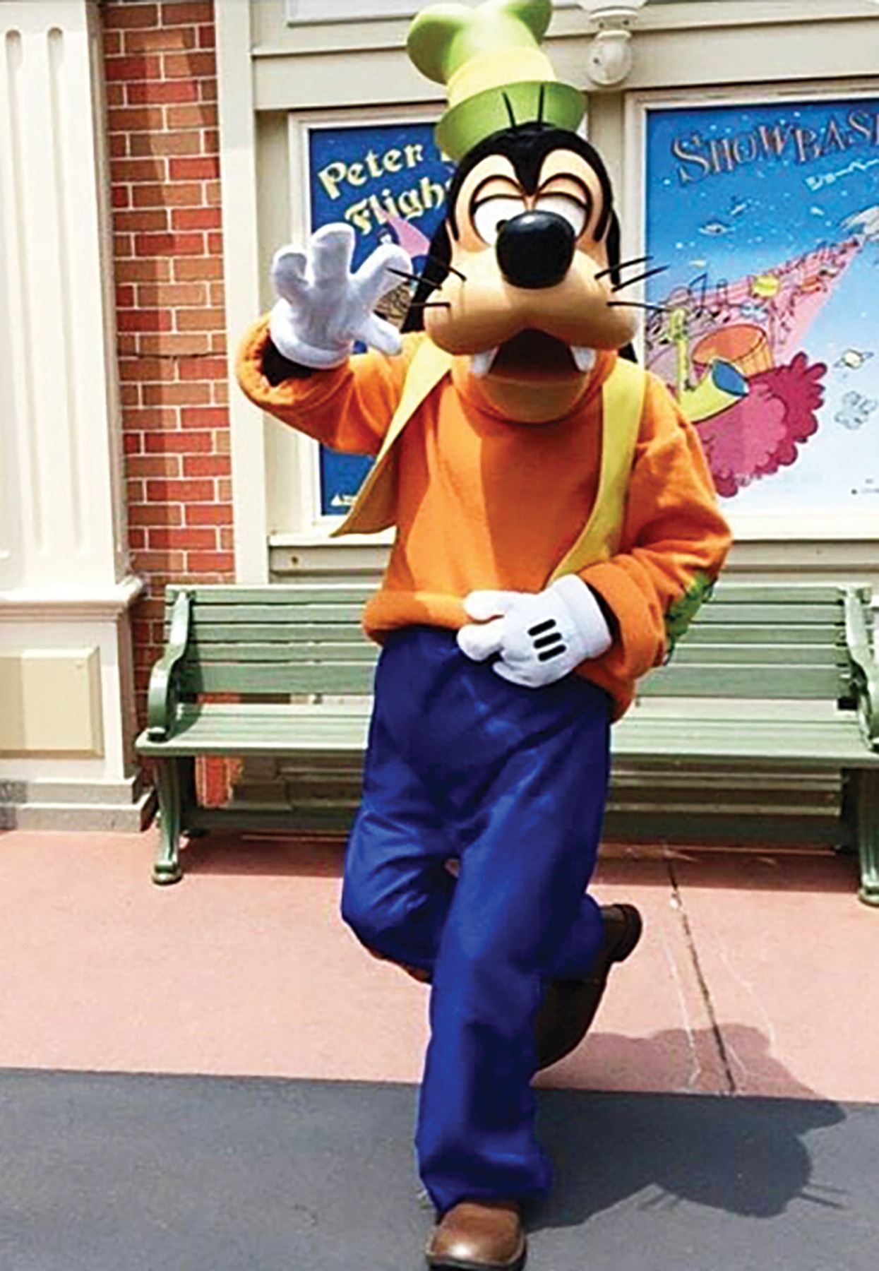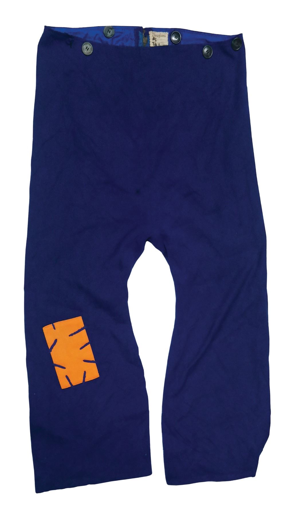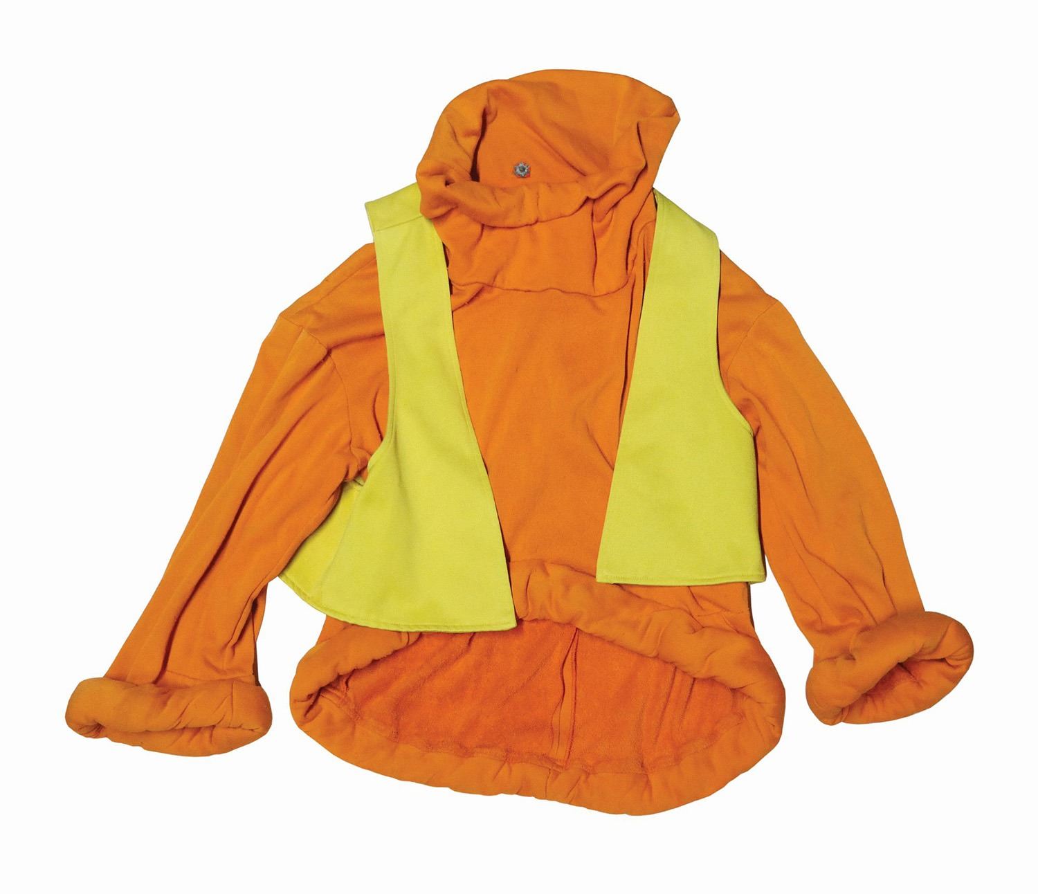 (Disneyland, 2010) An original costume used by a walk-around Goofy costumed character at Disneyland. The costume includes the shirt-vest and pants. The pants are marked a a size tall and the shirt is marked as a medium. The costume is in fair condition overall with wear, pilling to areas of the fabric on both articles, and small spots of discoloration throughout from use. Original wardrobe pieces from walk-around characters are some of the most scarce and desirable Disneyland wardrobe pieces.