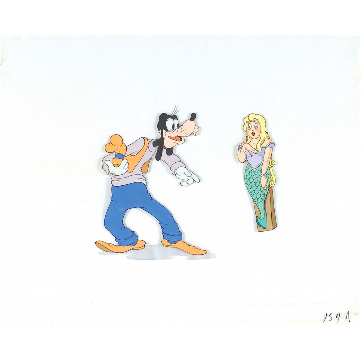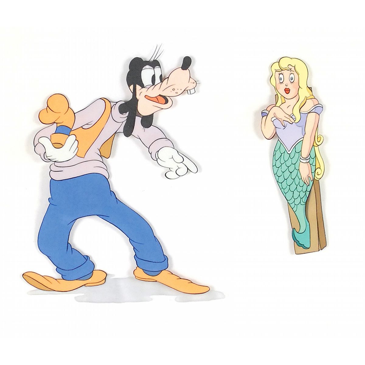 (Walt Disney Studios, 1938) Original production cel featuring Goofy and the mermaid ship’s figurehead from Boat Builders, showing Goofy doffing his cap in front of the mermaid, which plays a prominent role in a cute love gag in the second half of the short. Image measures 6 x 5 and is presented in a 17 x 13 mat. Professionally restored and in fine condition.